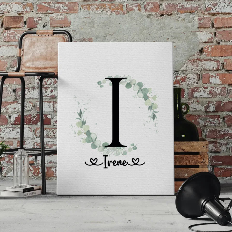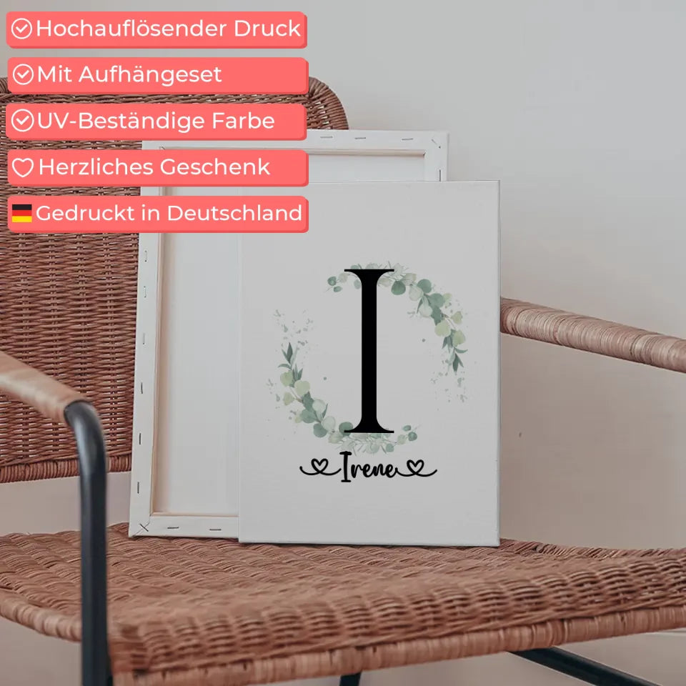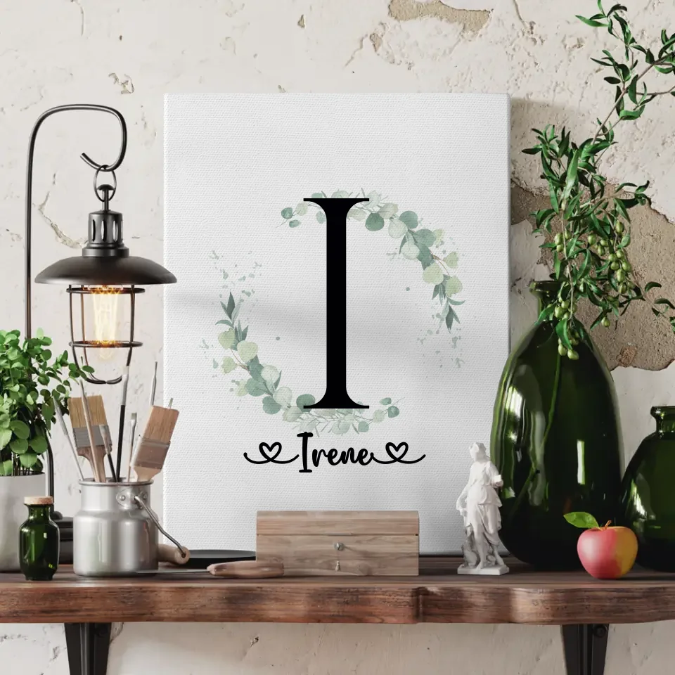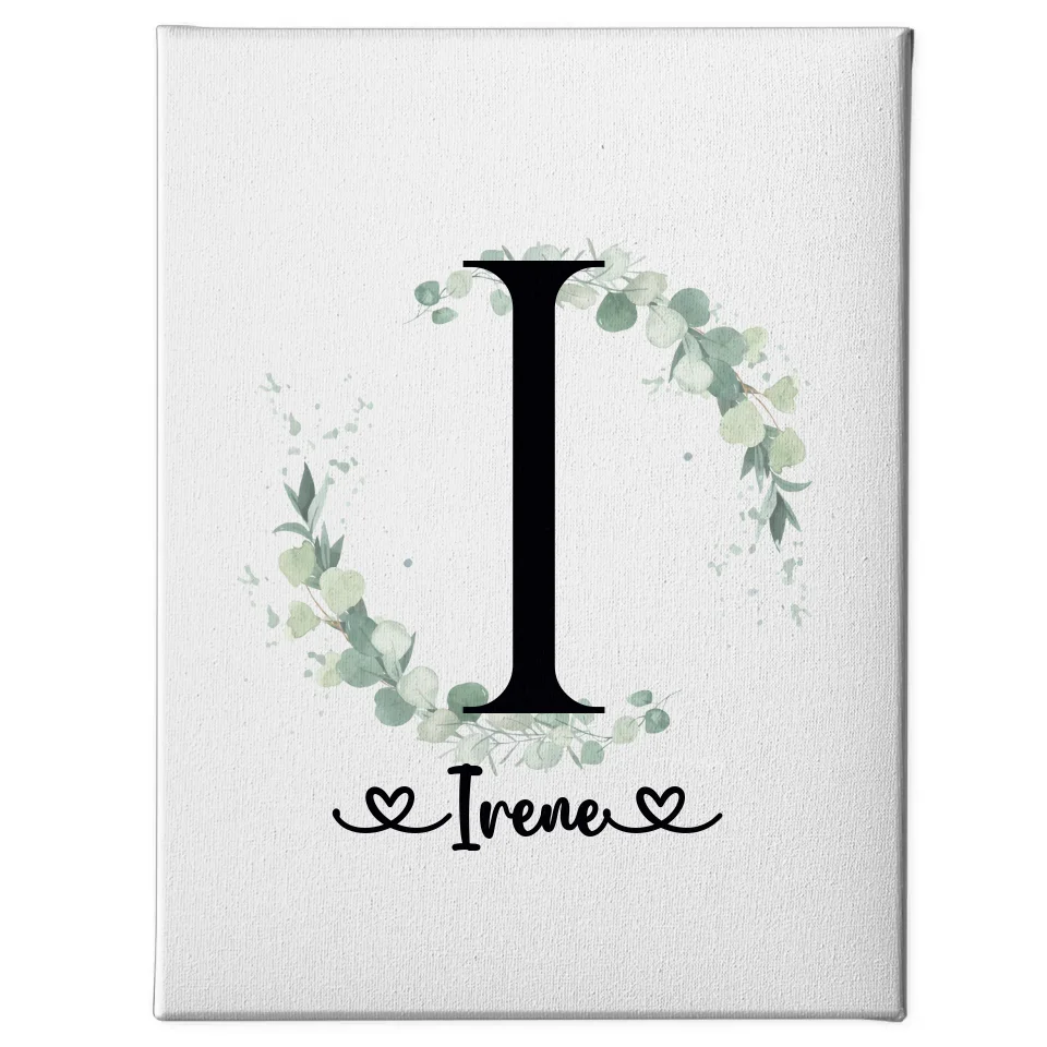 Personalisierte Leinwand Buchstaben I mit Eucalyptus Kranz