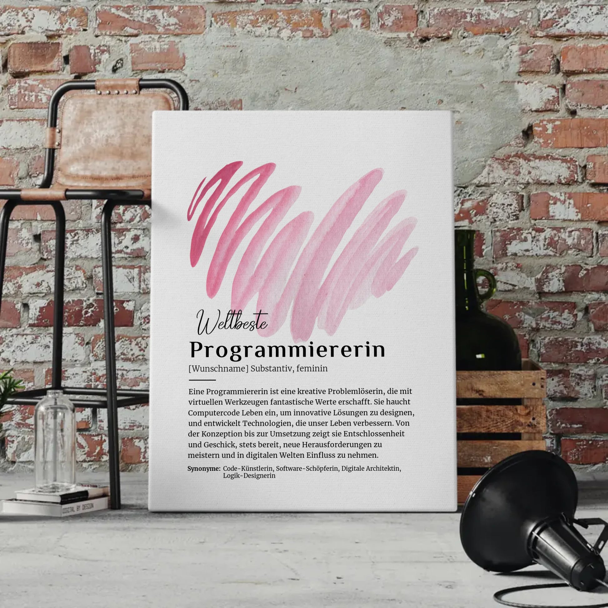 Mache dich bereit, der Programmiererin in deinem Leben ein Lächeln ins Gesicht zu zaubern! Bestelle noch heute deine personalisierte Leinwand Definition für Programmiererin mit Namen und lasse ihrer Kreativität freien Lauf.