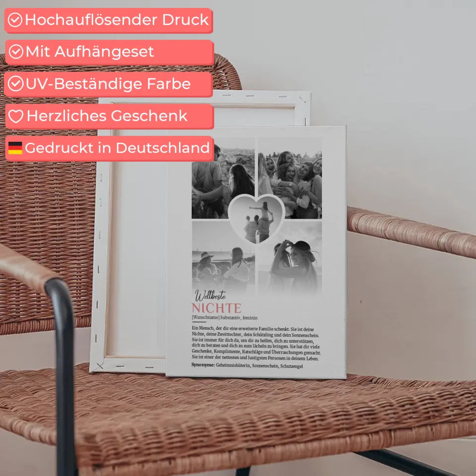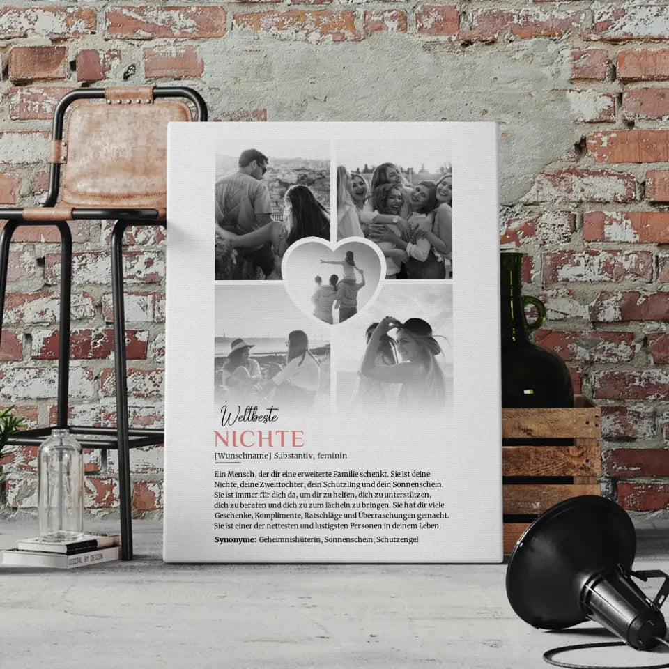 Dank der hochwertigen Verarbeitung und der Möglichkeit, die Leinwand nach deinen Wünschen zu gestalten, wird dieses personalisierte Geschenk zu einem echten Highlight. Überrasche deine Nichte mit dieser besonderen Leinwand und zeige ihr, wie viel sie dir bedeutet. Mache den einzigartigen Moment unvergesslich mit der personalisierten Leinwand Definition Nichte 5 Fotos Black & White mit Name!