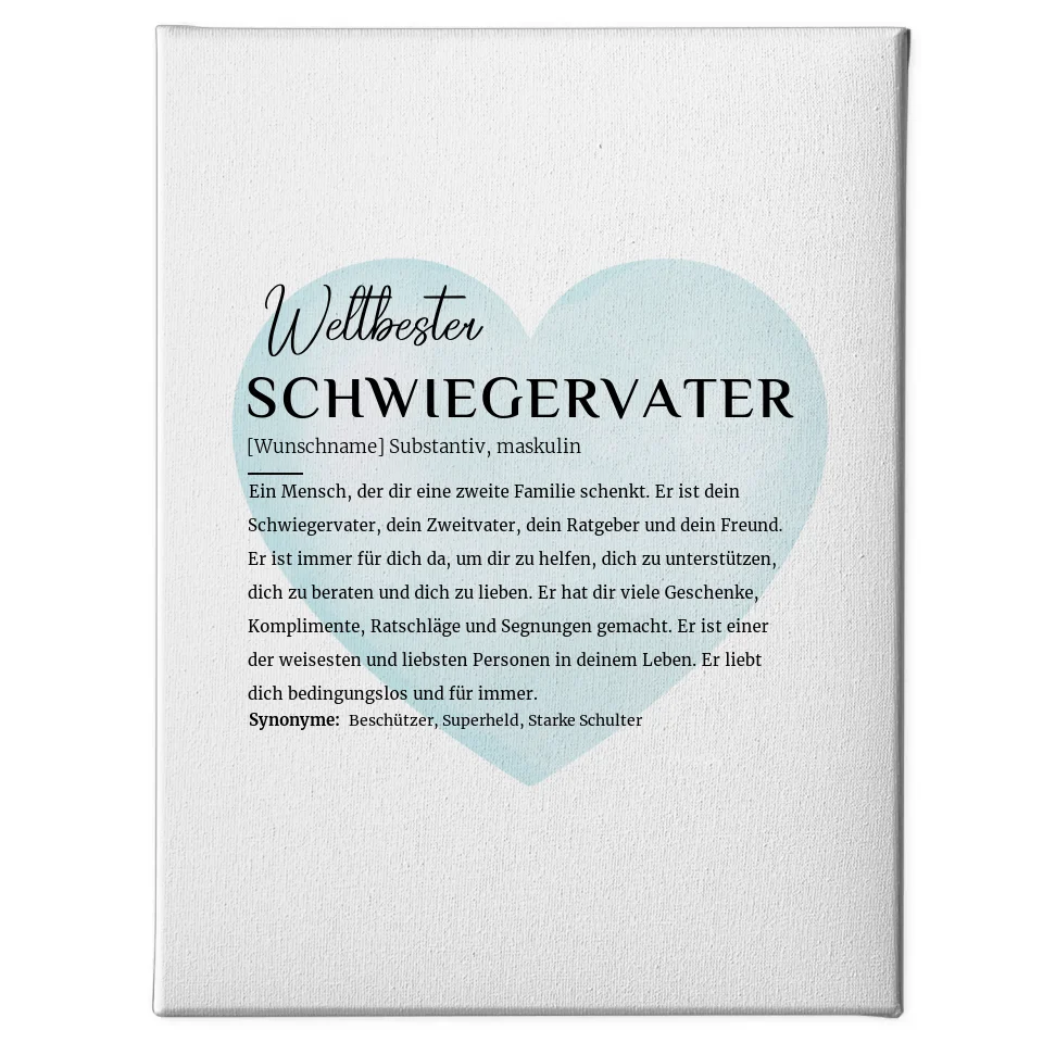 Mach es dir leicht und bestelle noch heute die personalisierte Leinwand Definition Schwiegervater mit Name Wasserfarben Herz Hellblau und bring Freude in sein Leben!
