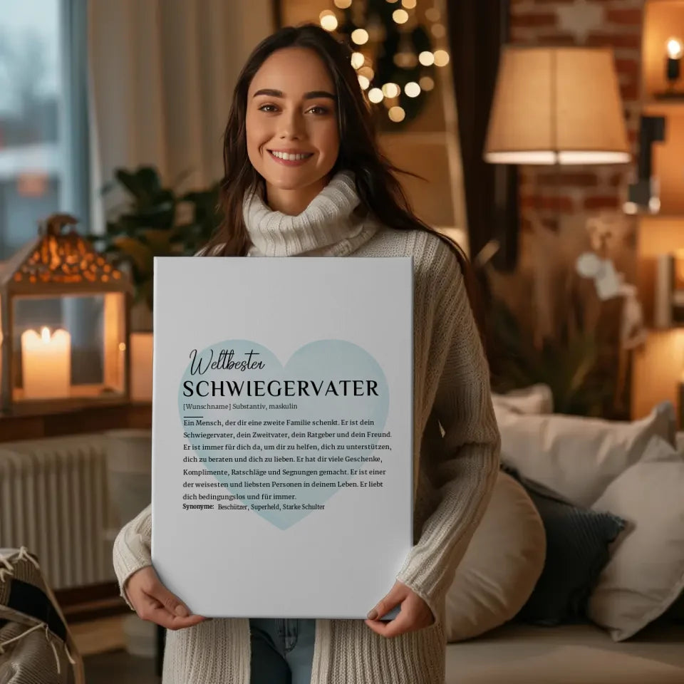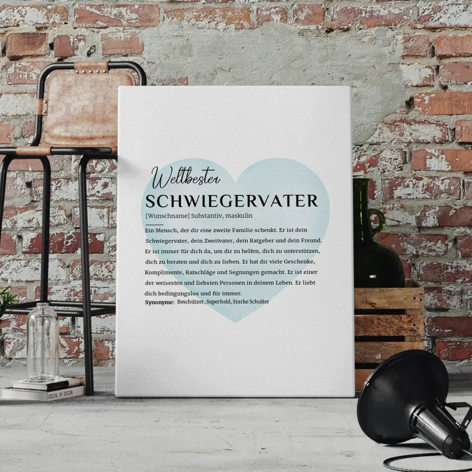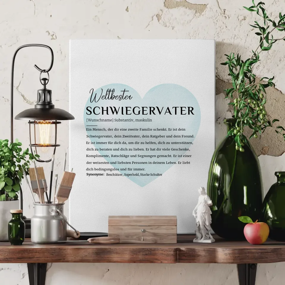 Die personalisierte Leinwand ist ideal für verschiedene Anlässe, sei es zum Geburtstag, Weihnachten oder einfach als besondere Geste, um deine Wertschätzung auszudrücken. Du hast die Möglichkeit, den Namen deines Schwiegervaters in das wunderschöne Design einzufügen, das mit sanften Wasserfarben in Hellblau gestaltet ist. Das Herz und die Definition machen dieses Kunstwerk zu einem echten Hingucker und einem bedeutungsvollen Geschenk.