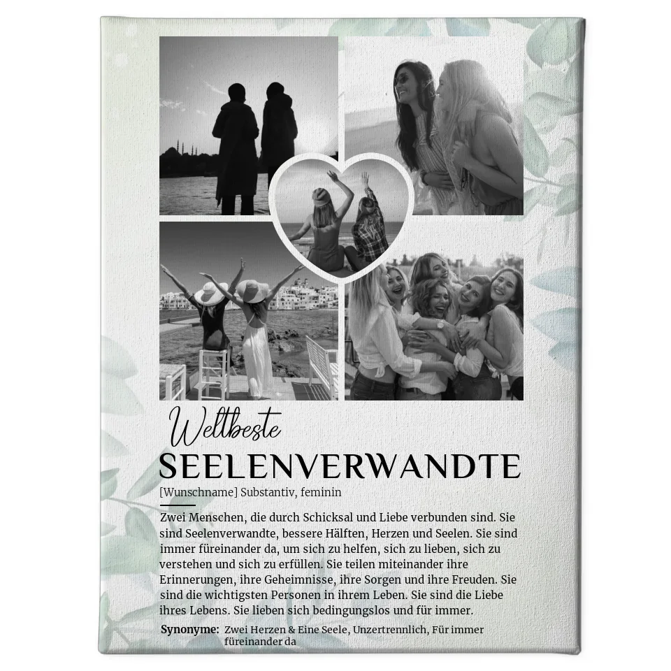 Entdecke die perfekte Möglichkeit, deine wertvollsten Erinnerungen festzuhalten mit unserer personalisierte Leinwand Definition Seelenverwandte. Diese einzigartige Leinwand bietet Platz für 5 Fotos und wird mit deinem persönlichen Namen sowie einem stilvollen Hintergrundbild im eleganten Eukalyptus Stil gestaltet. Egal, ob zum Valentinstag, Geburtstag oder Weihnachten – dieses personalisierte Geschenk ist das ideale Mitbringsel für deine Liebsten. Die Leinwand in Schwarz Weiß sorgt für einen zeitlosen Look, der in jedem Zuhause gut zur Geltung kommt. Schaffe mit der Definition Seelenverwandte ein Stück Kunst, das nicht nur schön aussieht, sondern auch von Herzen kommt. Mach jetzt dein persönliches Kunstwerk und zaubere ein Lächeln auf das Gesicht deines Lieblingsmenschen!