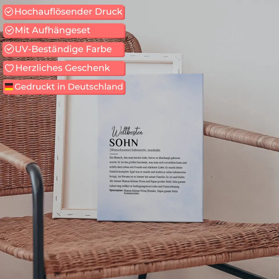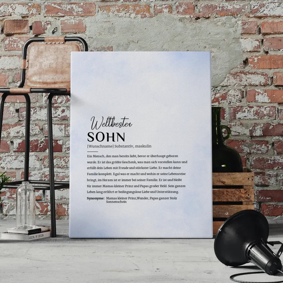 Entdecke die perfekte Geschenkidee mit unserer personalisierten Leinwand Definition Sohn Wasserfarben Stil Hellblau mit Name! Diese einzigartige Leinwand ist ein ideales Geschenk für jeden Anlass, sei es zum Geburtstag oder zu Weihnachten. Gestalte dieses persönliche Kunstwerk, indem du den Namen deines Sohnes sowie ein passendes Hintergrundbild auswählst. Die sanften Farben und der Wasserfarben Stil Hellblau verleihen der Leinwand einen zauberhaften und individuellen Touch, der in jedem Zuhause ein Blickfang ist. Mach deinem Sohn eine Freude mit diesem stilvollen, personalisierten Geschenk, das nicht nur dekorativ ist, sondern auch emotional berührt. Unsere Leinwand ist von hoher Qualität und wird speziell nach deinen Wünschen angefertigt. Lass dich von der Idee inspirieren, die Leinwand mit einer besonderen Botschaft oder einem Lieblingsmotiv zu kombinieren, um ein unverwechselbares und persönliches Geschenk zu kreieren. Kreiere jetzt deine Leinwand Definition Sohn im Wasserfarben Stil Hellblau und mache jeden Anlass unvergesslich!