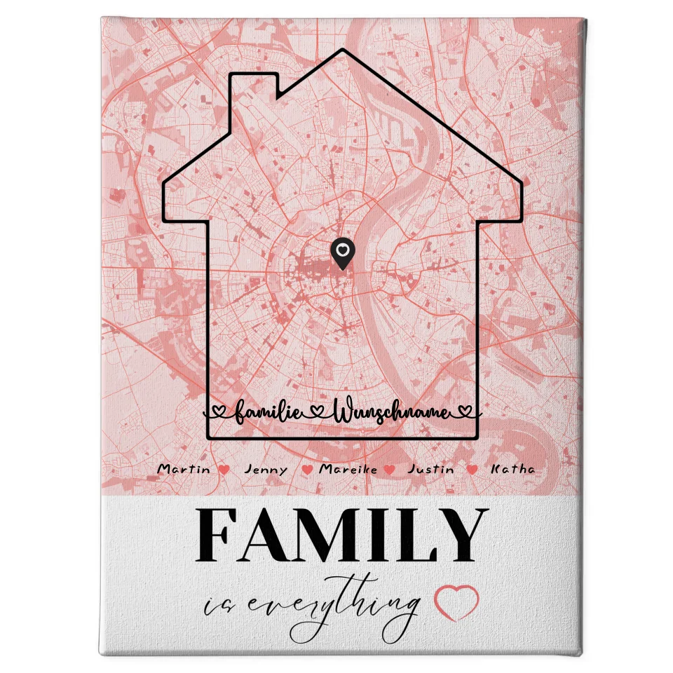 Mach einem lieben Menschen eine ganz besondere Freude mit unserer personalisierten Leinwand Familie Stadtkarte 'Family Is Everything' mit Nachname. Dieses wunderschöne Design zeigt nicht nur den liebevollen Spruch 'Zuhause ist wo die Liebe wohnt.', sondern ermöglicht es dir, eine individuelle Karte mit einem besonderen Ort, Namen und sogar einem änderbaren Spruch zu kreieren. Die Leinwand ist das perfekte Geschenk für jeden Anlass – ob Geburtstag, Weihnachten, Ostern, Muttertag oder Vatertag.
