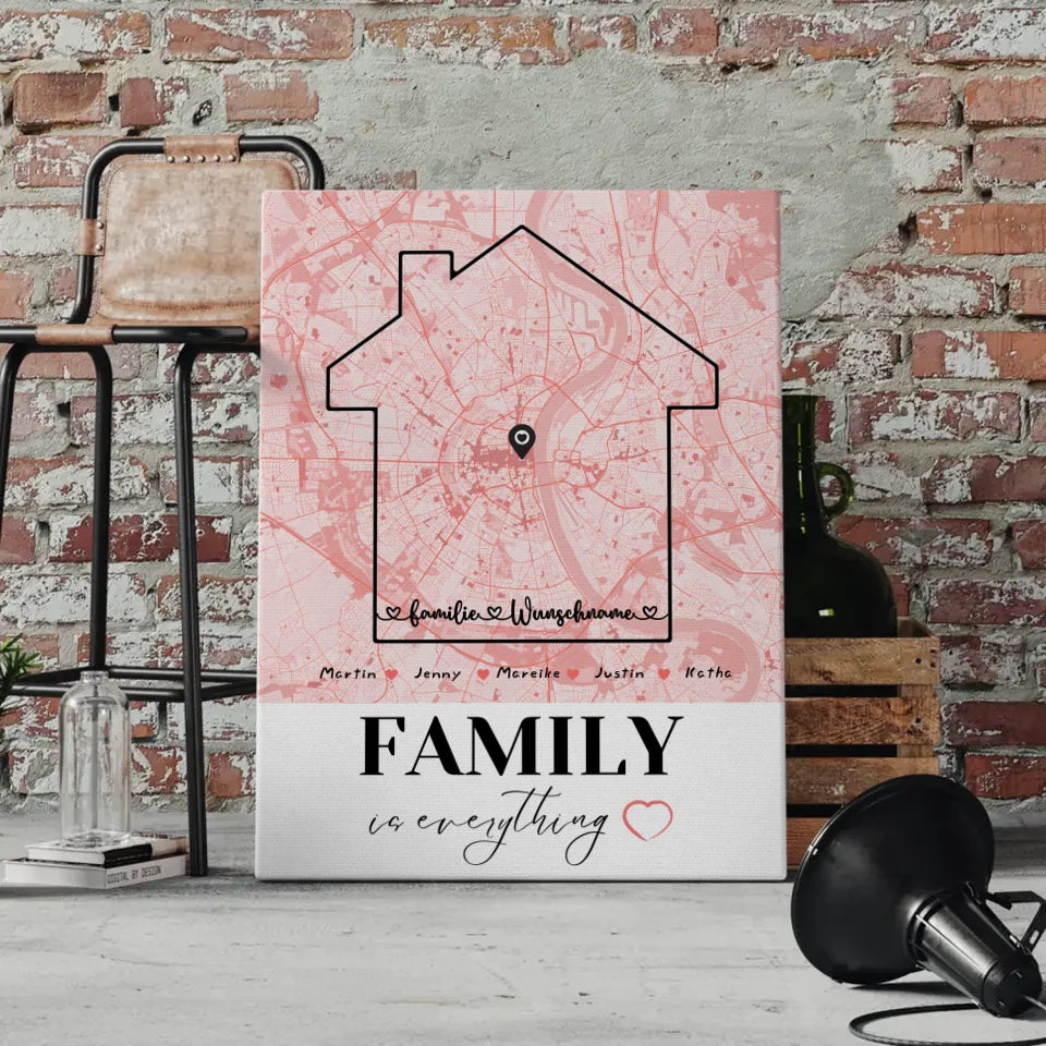 Entdecke die personalisierte Leinwand Familie Stadtkarte 'Family Is Everything' mit Nachname