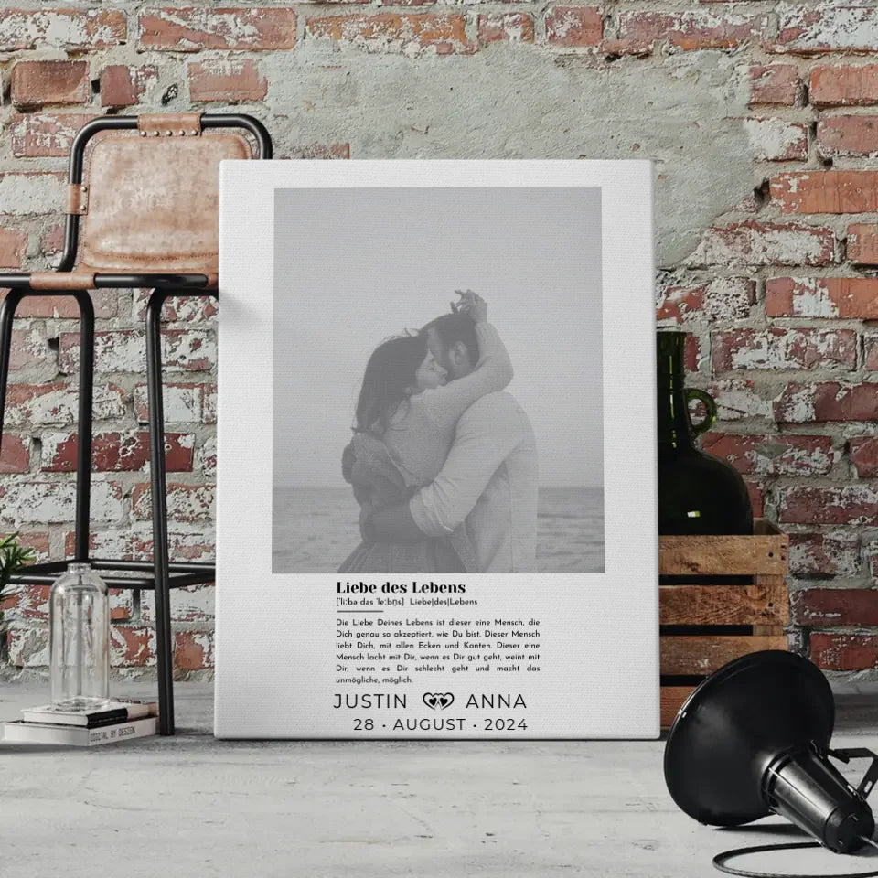 Das Design enthält den schönen Spruch 'Definition Liebe des Lebens', der nicht nur für Paare, sondern für alle, die ihre Liebe zueinander feiern möchten, perfekt geeignet ist. Jedes Detail dieser Leinwand ist so gestaltet, dass es deinen persönlichen Stil widerspiegelt und die besondere Bedeutung eurer Beziehung unterstreicht. Ob in zeitlosem Black & White oder in einer anderen Farbgebung, diese Leinwand wird ein echter Blickfang in deinem Zuhause sein.