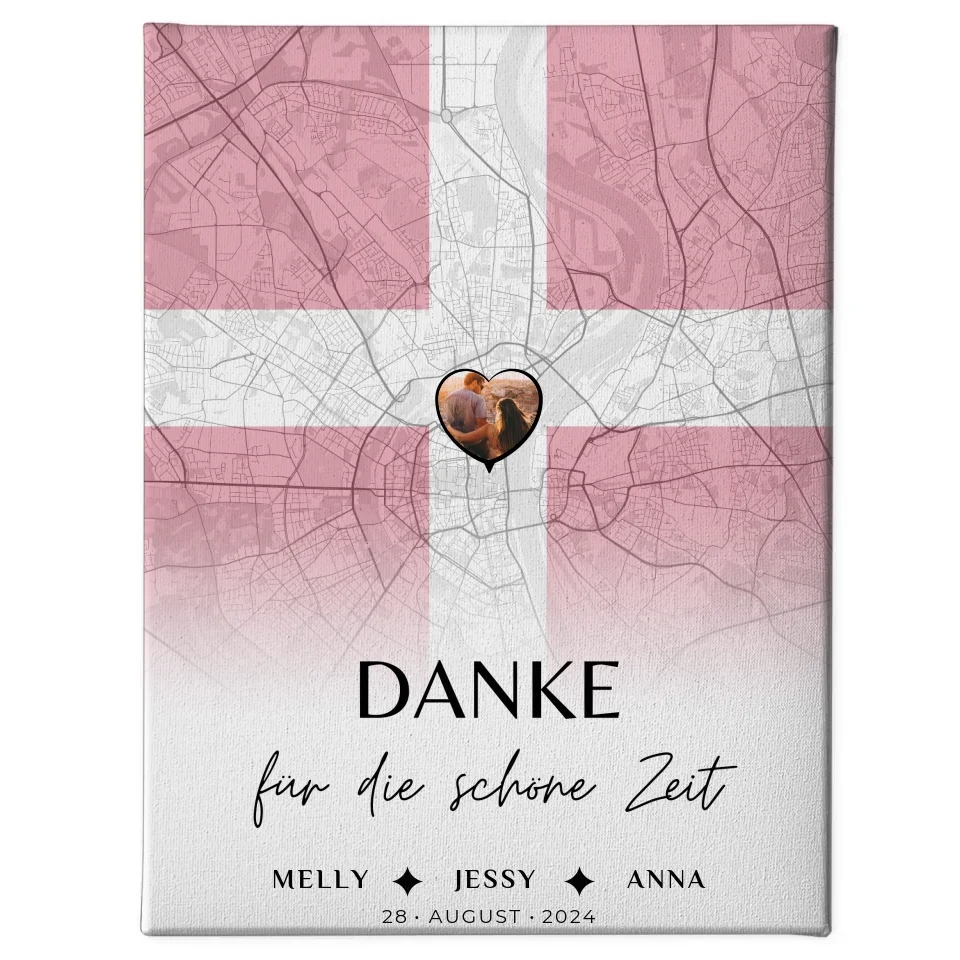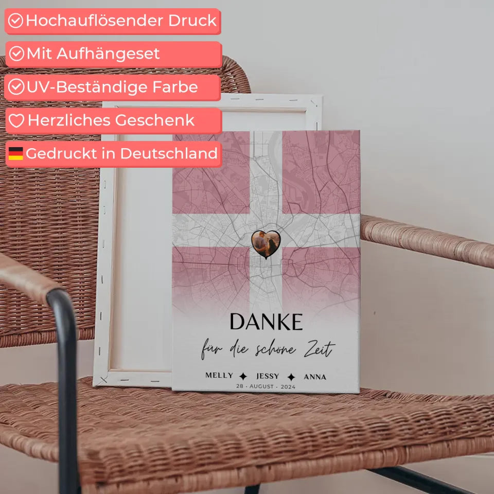 Ăberrasche deine Schwester mit einer einzigartigen und personalisierten Leinwand, die Erinnerungen in Form einer Stadtkarte DĂ€nemarks und einem persönlichen Foto vereint. Unsere 'Personalisierte Leinwand fĂŒr Schwester Stadtkarte DĂ€nemark Foto Danke' ist das perfekte Geschenk fĂŒr besondere AnlĂ€sse wie Geburtstage, Weihnachten oder einfach als nette Aufmerksamkeit. Du kannst bei diesem tollen Geschenk das Foto, die Karte mit einem besonderen Ort, bis zu 5 Namen sowie deinen eigenen Wunschtext individuell gestalten. Das Design wird durch den schönen Spruch 'Danke FĂŒr Die Schöne Zeit' ergĂ€nzt, der deine WertschĂ€tzung perfekt ausdrĂŒckt. Diese personalisierte Leinwand bringt nicht nur Farbe in den Raum, sondern auch Herzen zum Leuchten. Verschenke unvergessliche Momente mit diesem personalisierten Kunstwerk, das verbindet und Freude bereitet.