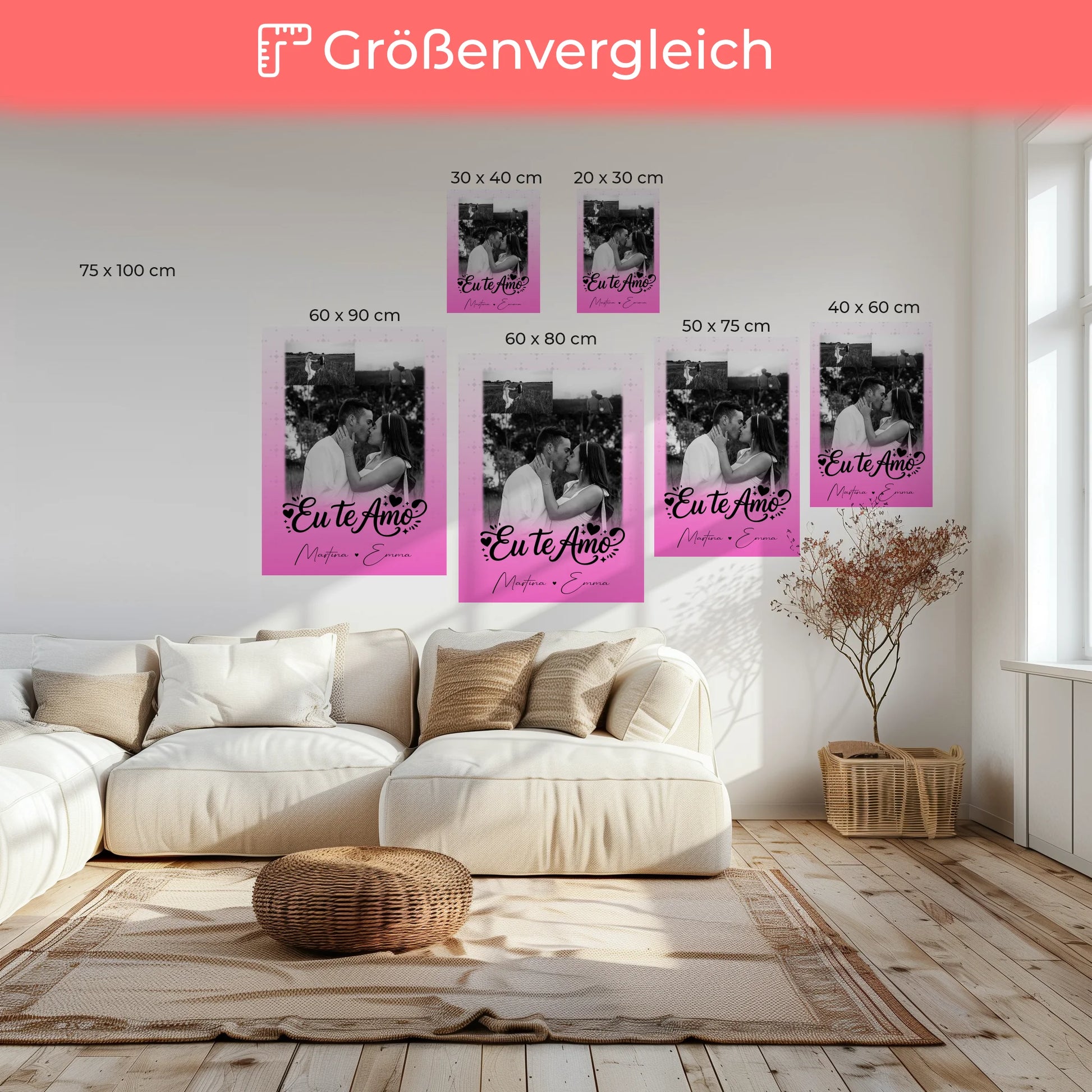 Der elegante Schriftzug Eu te amo – Liebe auf Portugiesisch bildet das zentrale Designelement und verleiht deinem Poster eine romantische und exotische Note. Zeige deinem Partner auf stilvolle Weise, wie viel er oder sie dir bedeutet. Dieses Kunstwerk ist nicht nur eine schöne Dekoration, sondern auch ein tägliches Bekenntnis eurer Zuneigung.