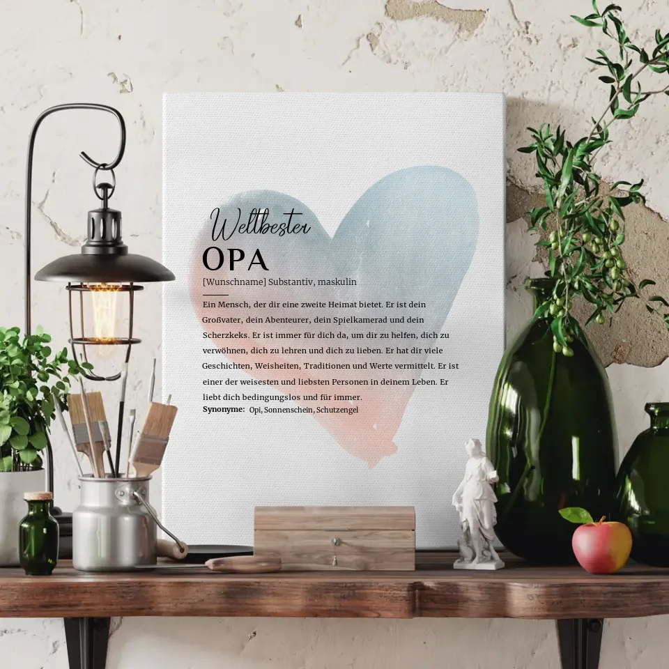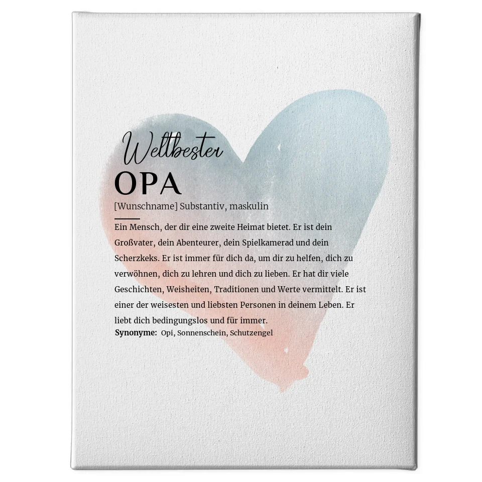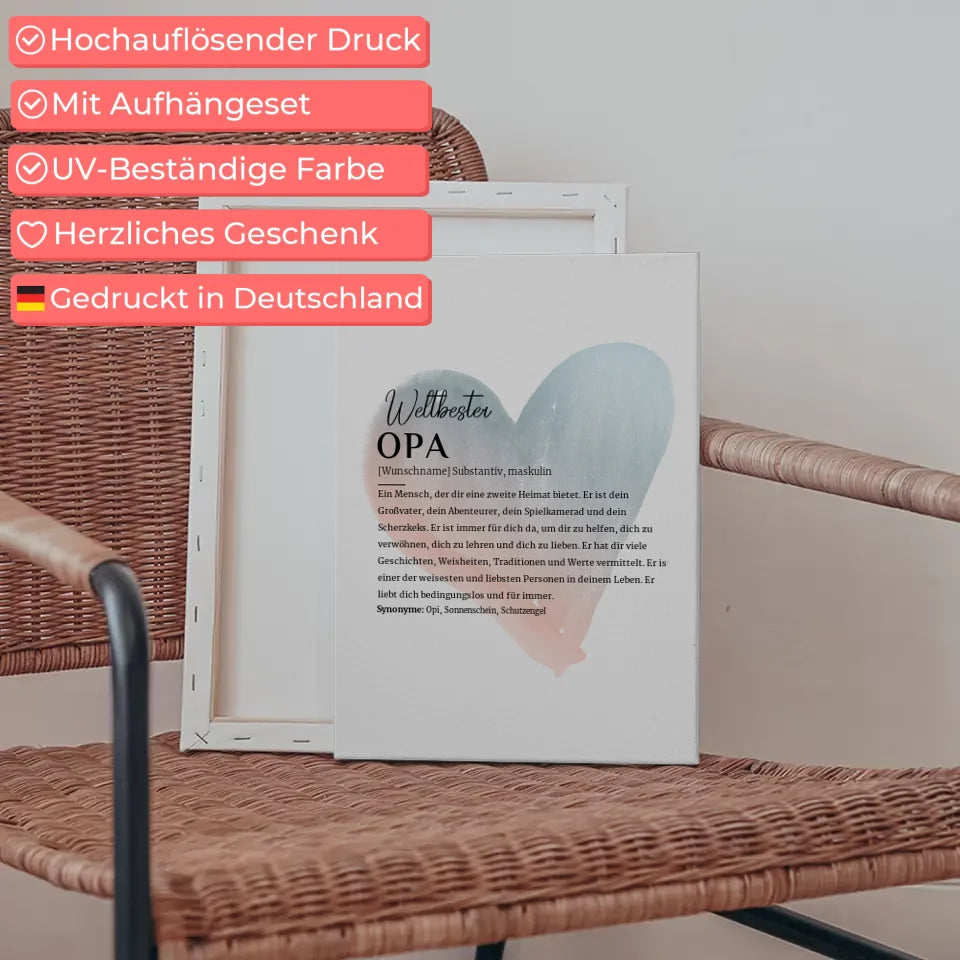 Die Leinwand ist nicht nur ein wunderschönes Dekorationsstück, sondern auch eine liebevolle Hommage an die Definition Opa. Egal ob zum Geburtstag, zu Weihnachten, zu Ostern, zum Muttertag oder zum Vatertag – dieses personalisierte Geschenk sorgt für strahlende Augen und bleibende Erinnerungen.