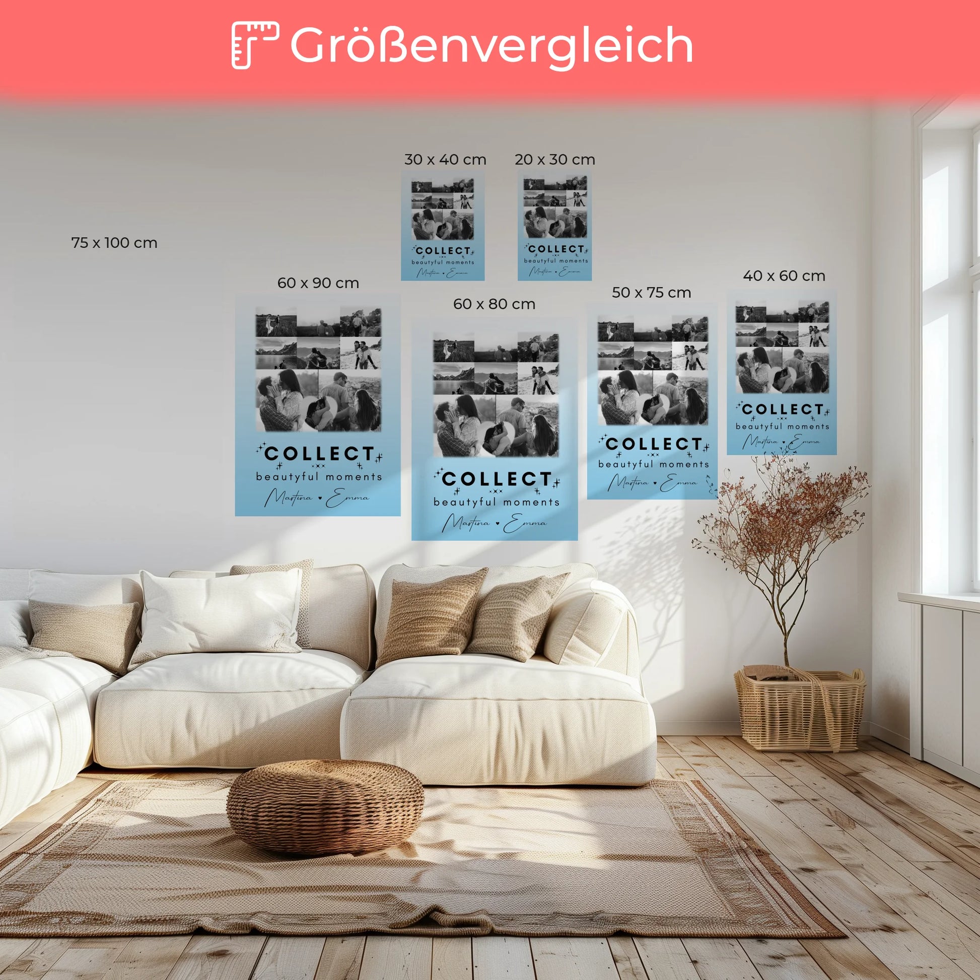 Das Design wird durch den inspirierenden Spruch Collect Beautiful Moments abgerundet, der euch täglich daran erinnert, die schönen Momente des Lebens gemeinsam zu sammeln. Dieses personalisierte Leinwand-Poster ist mehr als nur ein Bild; es ist ein Zeugnis eurer gemeinsamen Reise und ein wundervolles Geschenk für Paare, das von Herzen kommt.