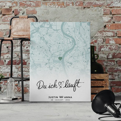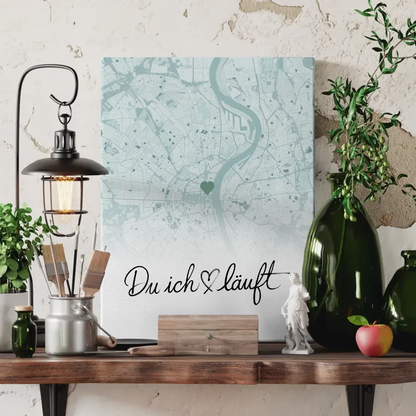 Entdecke die perfekte Geschenkidee für deine Liebsten mit unserer personalisierten Leinwand Stadtkarten für Paare in mintgrün. Diese einzigartige Leinwand vereint zugleich eine stilvolle Gestaltung und eine persönliche Note. Wähle einen ganz besonderen Ort aus, der für euch beide von Bedeutung ist - wo alles begann. Ergänze das Design mit euren Namen und einem individuellen Spruch oder Wunschtext. Der schöne Spruch 'Du Ich Läuft' macht dieses Geschenk zu einem unvergesslichen Highlight für jeden Anlass.