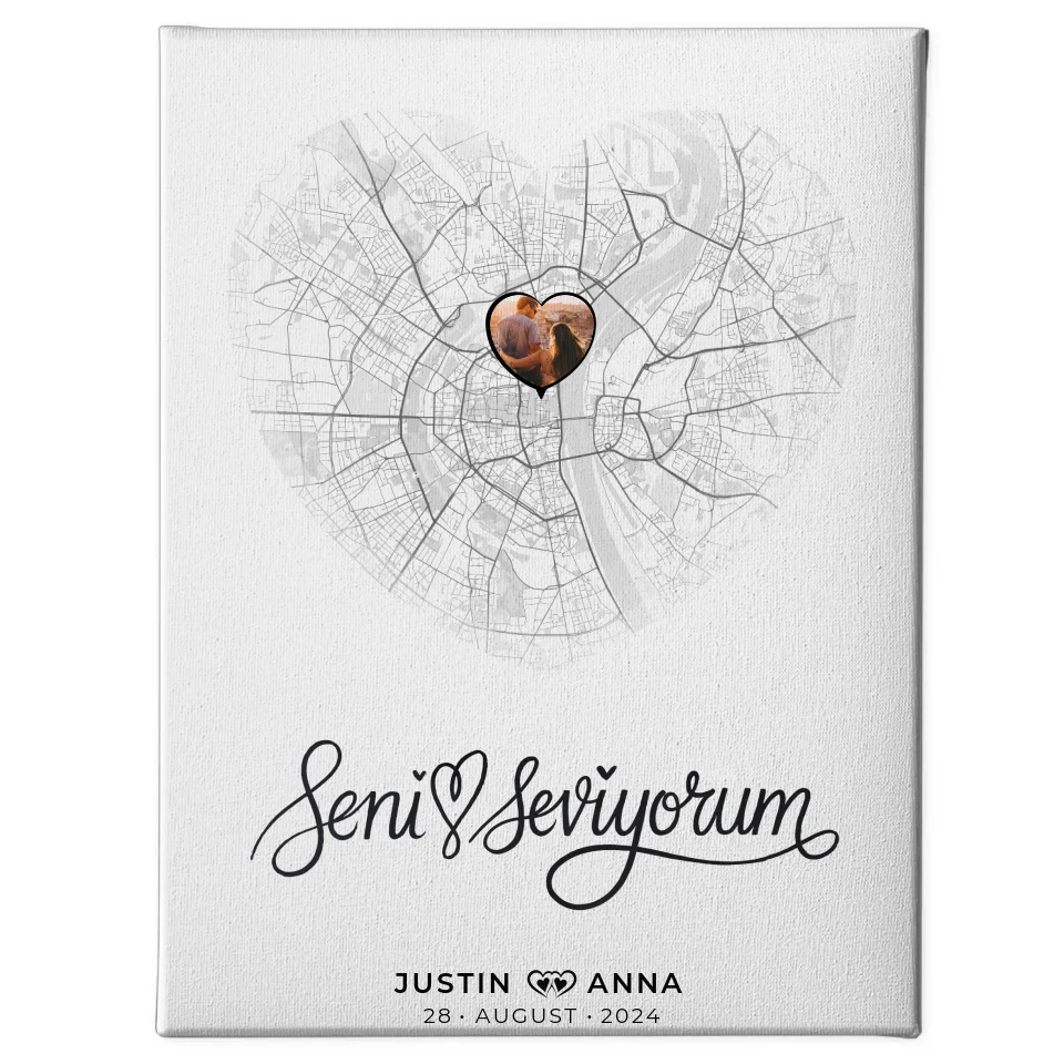 Überrasche deinen Liebsten mit unserer einzigartigen personalisierten Leinwand Stadtkarten Paare Herz Seni Seviyorum. Diese besondere Leinwand vereint romantisches Design mit persönlicher Note und eignet sich perfekt für verschiedene Anlässe wie den Valentinstag, Geburtstage oder sogar Weihnachten. Das Highlight dieser Leinwand ist der wunderschöne Spruch 'Seni Seviyorum', der deine Gefühle perfekt zum Ausdruck bringt.