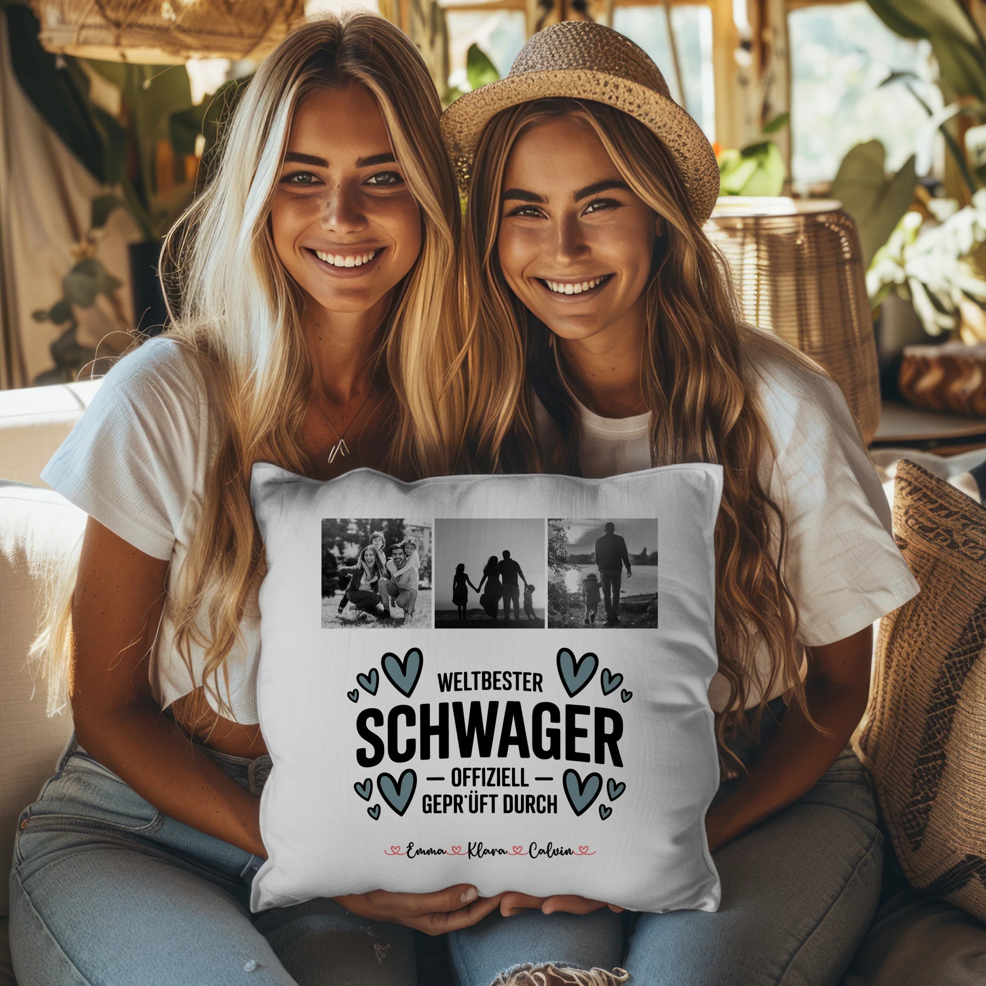 Überrasche deinen Schwager mit einem einzigartigen und liebevoll gestalteten Geschenk: Das Personalisierte Namen Kissen mit Fotocollage Schwager Weltbester Schwager Offiziell Geprüft Durch ist die ideale Wahl, um Wertschätzung und Verbundenheit auszudrücken. Dieses Kissen kannst du ganz individuell gestalten - wähle drei deiner schönsten Fotos aus, personalisiere die Namen und entscheide dich für ein Hintergrundbild, das perfekt zu deinem Schwager passt. Ob klassisch weiß, im floralen oder Wasserfarben-Stil, mit Holz-Optik oder mit Mustern wie Sterne oder Blüten - hier sind deiner Kreativität keine Grenzen gesetzt. Die Fotos kannst du farbig lassen oder mit einem stilvollen Schwarz-Weiß-Filter versehen, um dem Kissen eine besondere Note zu verleihen. Das Design wird durch den liebevollen Spruch „Weltbester Schwager Offiziell Geprüft Durch abgerundet, der deinem Geschenk eine persönliche und humorvolle Botschaft verleiht. Dieses Kissen ist nicht nur ein echter Hingucker auf dem Sofa, sondern auch ein emotionales Erinnerungsstück, das zu jedem Anlass passt - ob Geburtstag, Weihnachten, Jubiläum oder einfach als kleine Aufmerksamkeit zwischendurch. Mache deinem Schwager eine Freude, die von Herzen kommt, und schenke ihm ein Personalisierte Namen Kissen mit Fotocollage Schwager Weltbester Schwager Offiziell Geprüft Durch, das so einzigartig ist wie eure Beziehung!