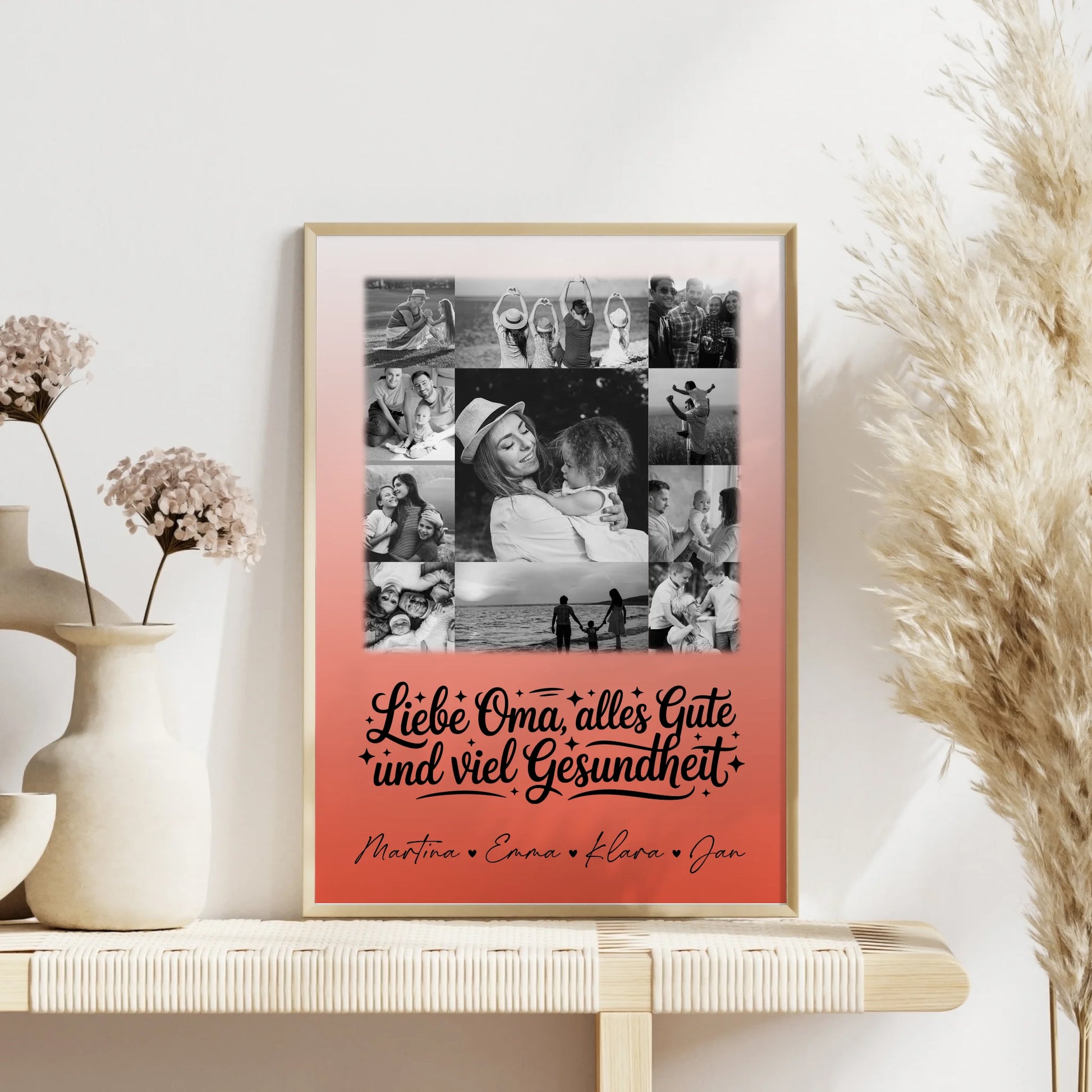 Personalisierte Oma Plakat mit 11 Fotos für alles Gute und Gesundheit Schwarz-Weiß Geschenk