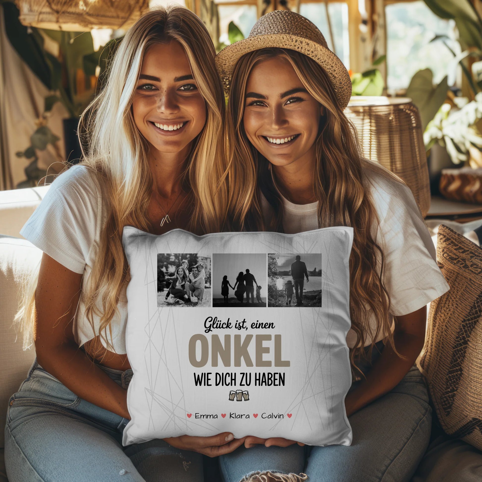 Bestelle jetzt Dein Personalisierte Onkel Kissen mit Fotocollage - Glück Ist Einen Onkel Wie Dich Haben Geschenkidee und verschenke ein Unikat, das Liebe, Wertschätzung und schöne Erinnerungen vereint!