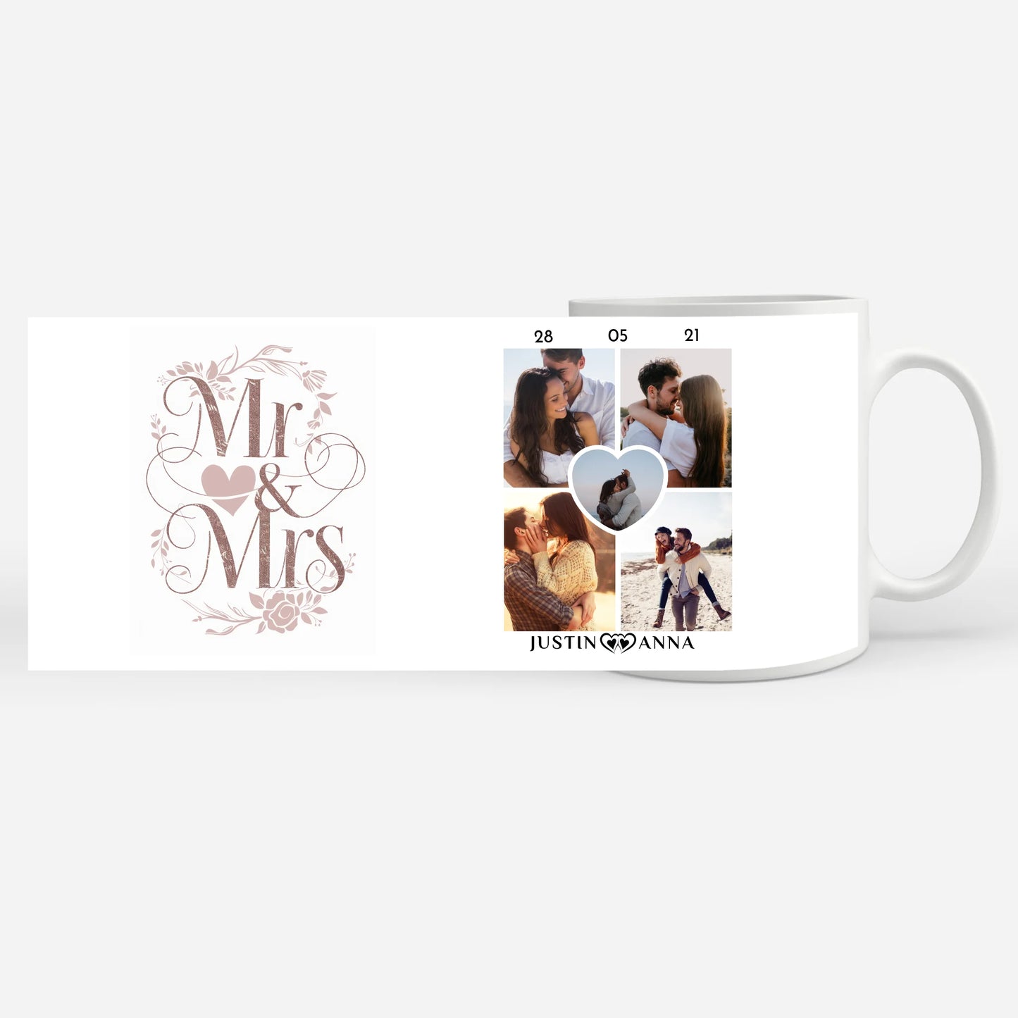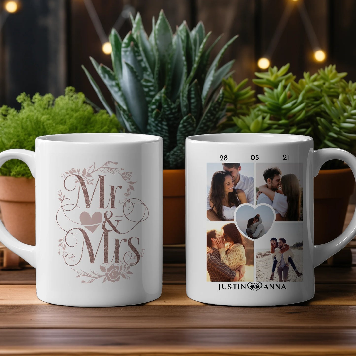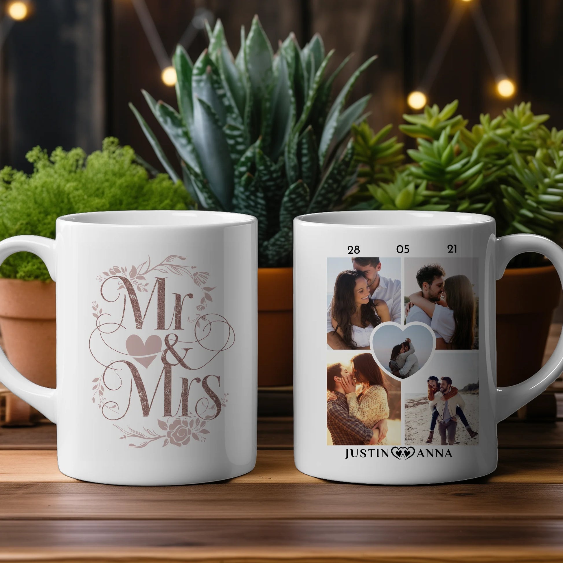 Du würdest gerne etwas einzigartiges schenken? Dann ist Unsere Personalisierte Pärchen Tasse Mr & Mrs Pinke Rosen mit 5 Fotos ein einzigartiges personalisiertes Geschenk.