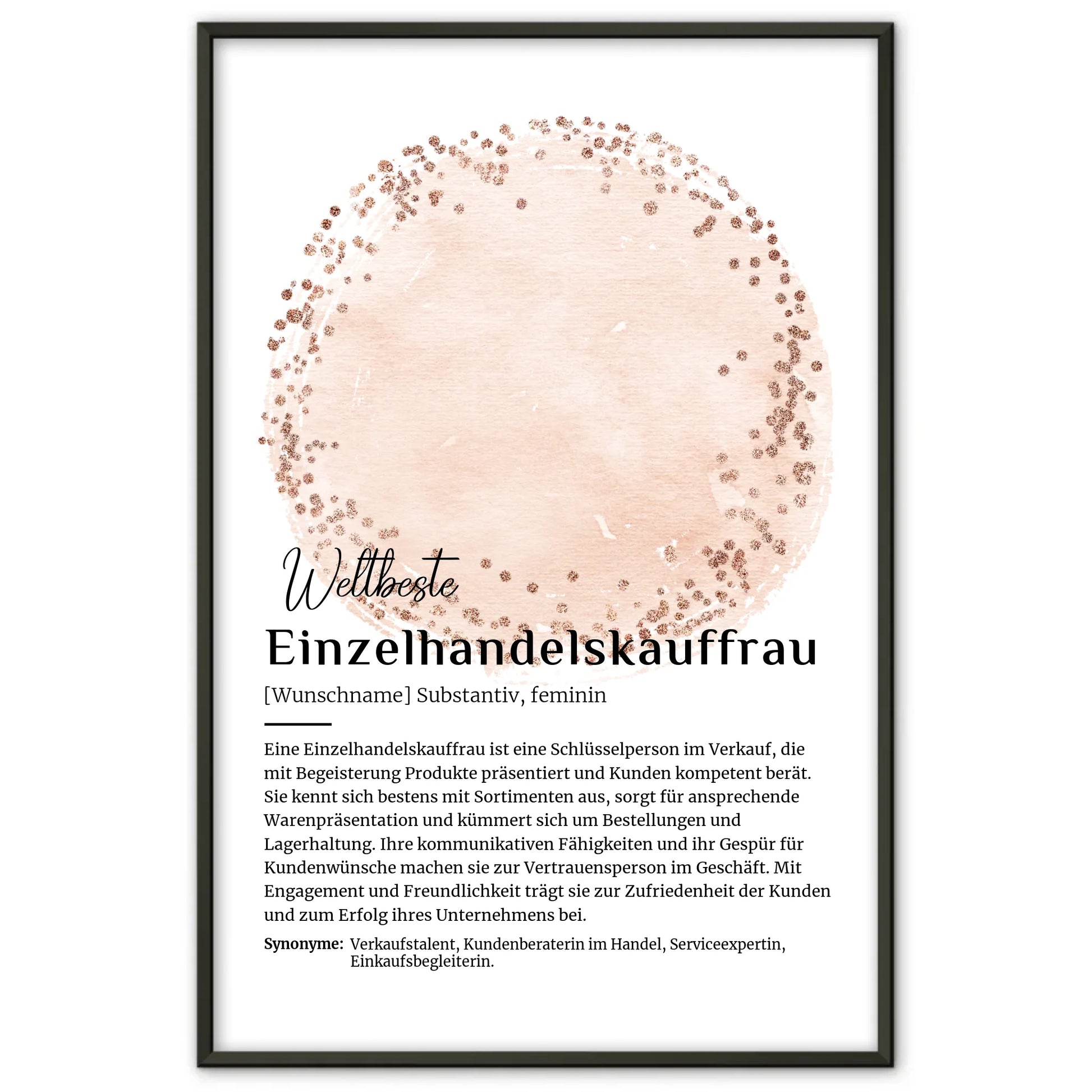 Mache deinen Liebsten eine Freude mit einem individuellen Kunstwerk, das ihre berufliche Leidenschaft widerspiegelt. Bestelle jetzt dein Personalisierte Poster Definition Einzelhandelskauffrau mit Namen Geschenk und überrasche sie mit einem unvergesslichen Präsent!