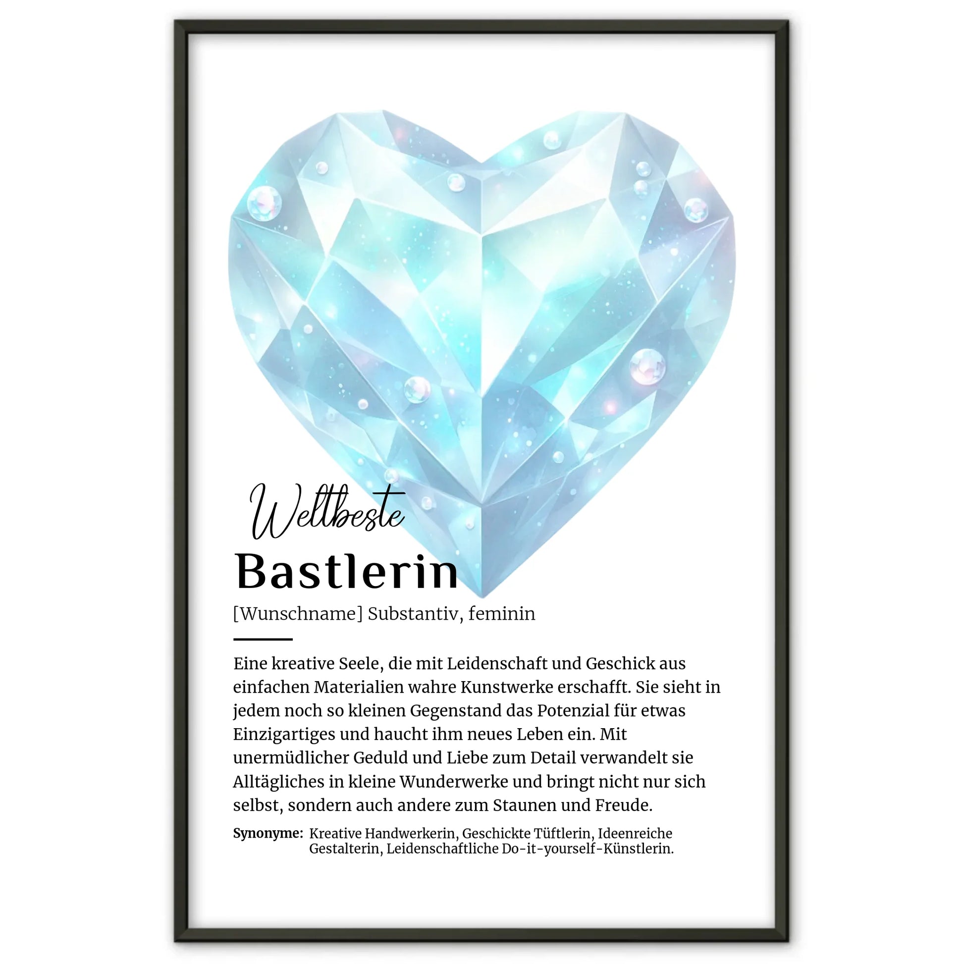 Suchst du nach einem einzigartigen und persönlichen Geschenk für eine kreative Bastlerin in deinem Leben? Unser personalisierte Poster Definition für Bastlerin mit Namen ist die perfekte Wahl! Dieses individuelle Posters ist nicht nur ein echter Hingucker, sondern auch ein ganz persönliches Stück für jede Bastel-Liebhaberin.
