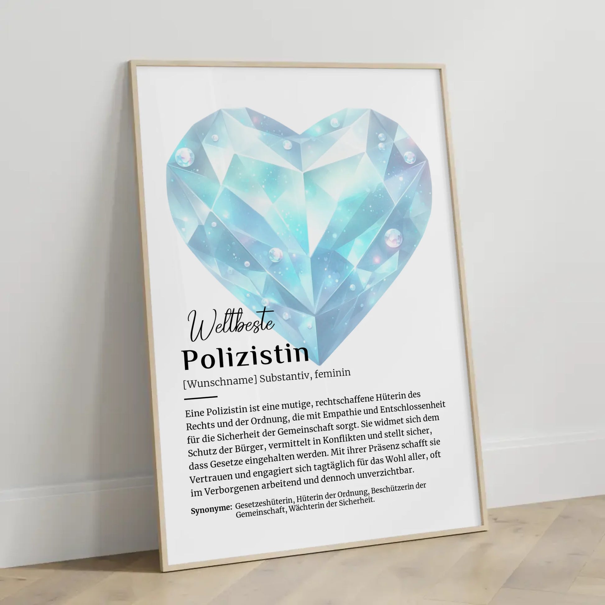 Du suchst nach einem einzigartigen und persönlichen Geschenk für eine Polizistin in deinem Leben? Unser Personalisierte Poster Definition Polizistin mit Namen Geschenk ist die perfekte Wahl! Dieses besondere Poster bietet dir die Möglichkeit, den Namen der beschenkten Person sowie ein individuelles Hintergrundbild zu personalisieren. Es ist nicht nur ein dekoratives Element, sondern auch eine liebevolle Geste, die zeigt, wie sehr du ihre Arbeit und ihren Einsatz schätzt.