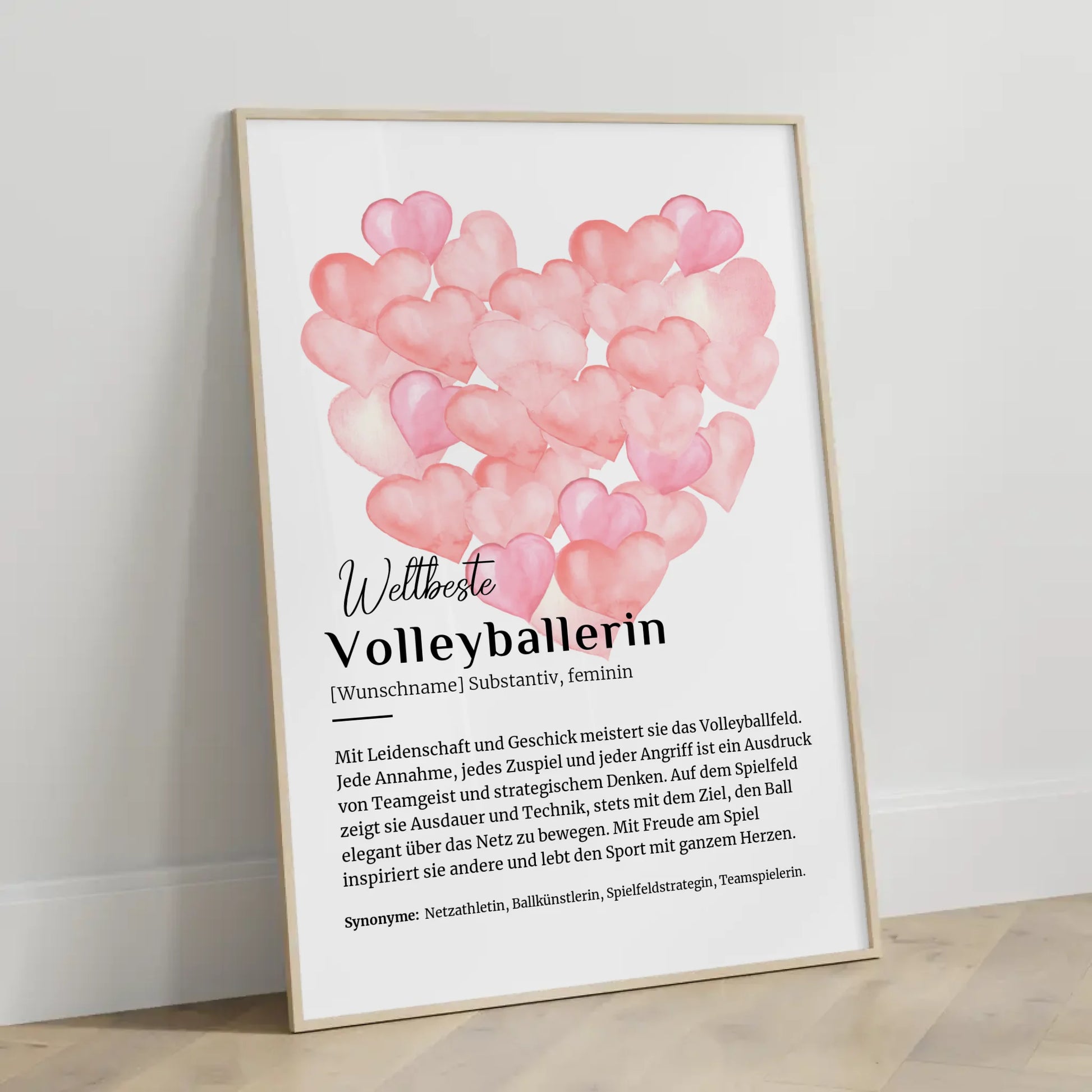 Unsere Poster Definition bietet eine detaillierte Beschreibung der Eigenschaften einer echten Volleyballerin, ergänzt durch den individuell gewählten Namen. So entsteht ein einzigartiges Kunstwerk, das in jedem Raum zum Blickfang wird.