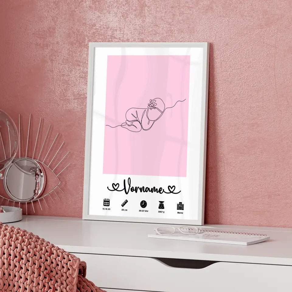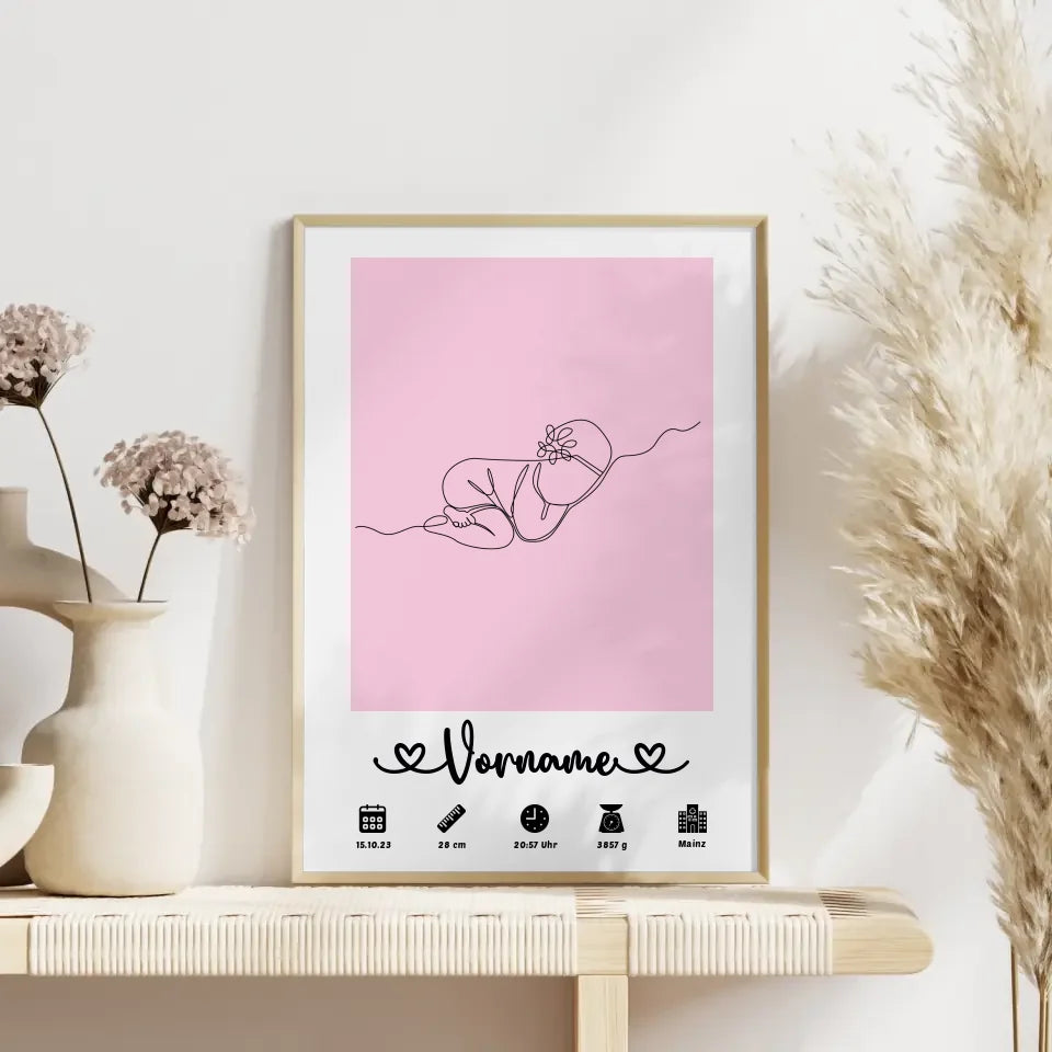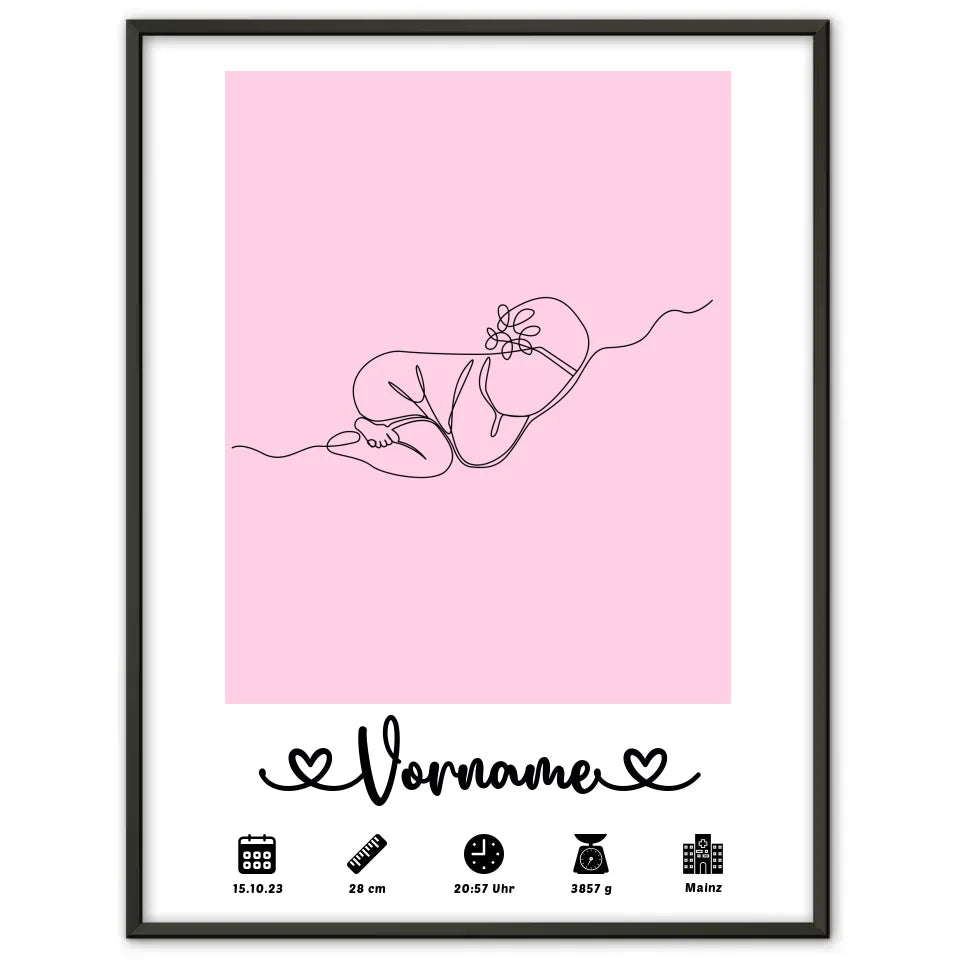 Personalisierte Poster Geburt Baby Schläft Lineart Hellrosa Kinderzimmer