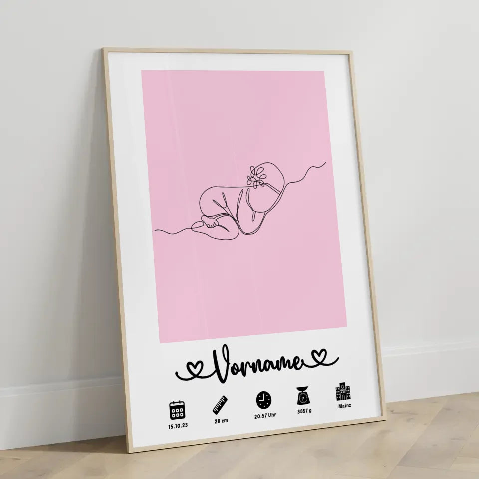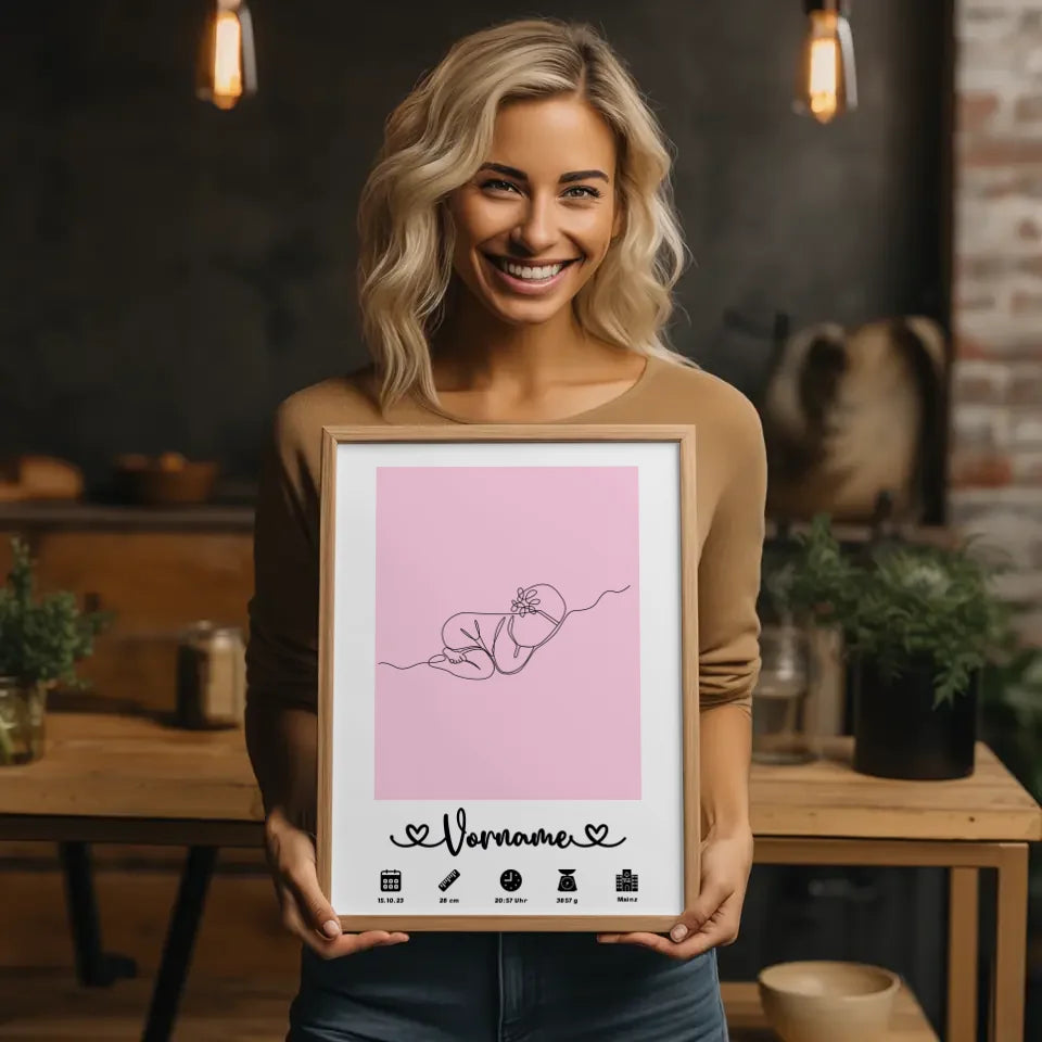 Jedes Poster wird individuell für dich personalisiert und kann zudem den Namen deines Neugeborenen sowie ein zauberhaftes Hintergrundbild enthalten. So wird jedes Kunstwerk im hellrosa Farbton zum absoluten Hingucker im Kinderzimmer. Ideal als Geschenk zum Geburtstag oder als erinnerungswürdiges Element zur Feier der Geburt deines Kindes. Bringe Farbe und eine persönliche Note in das Zimmer deines Babys mit diesem zauberhaften Baby Schläft Lineart Design.