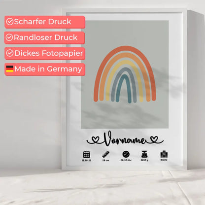 Das Regenbogen BuntDesign auf dem Papyrusweiß Hintergrund sorgt für ein fröhliches und einladendes Ambiente. Schaffe eine liebevolle Umgebung, in der sich dein Kind wohlfühlen kann. Ein Poster Geburt, das in jedem Kinderzimmer zum Blickfang wird!