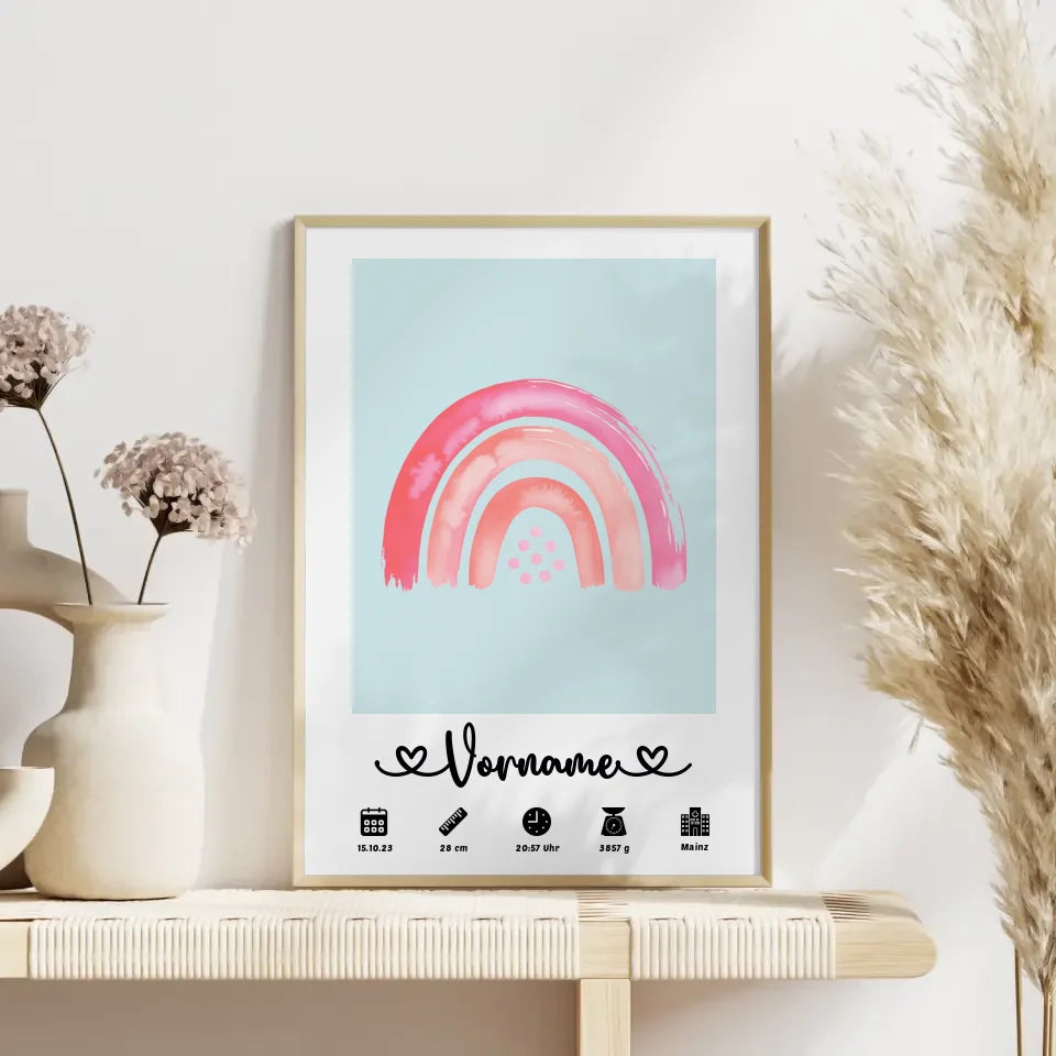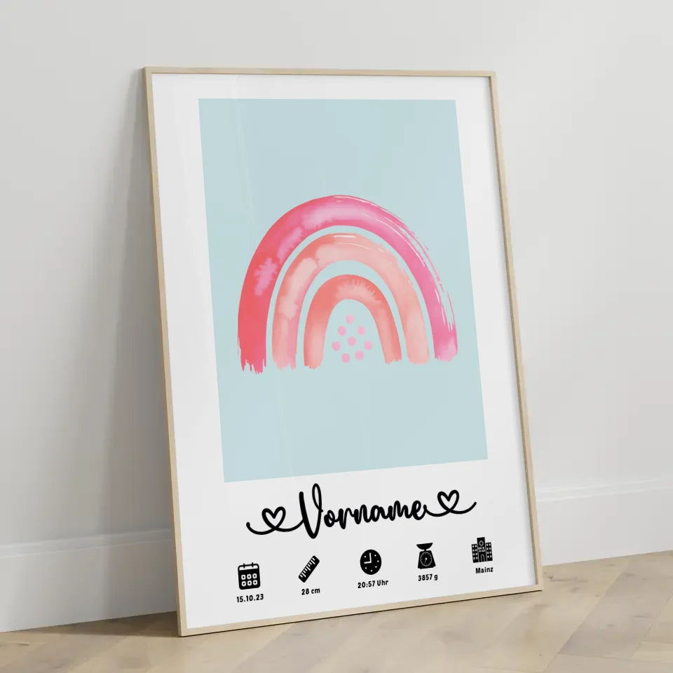 Personalisierte Poster Geburt Regenbogen Rosa Blaugrau für Kinderzimmer