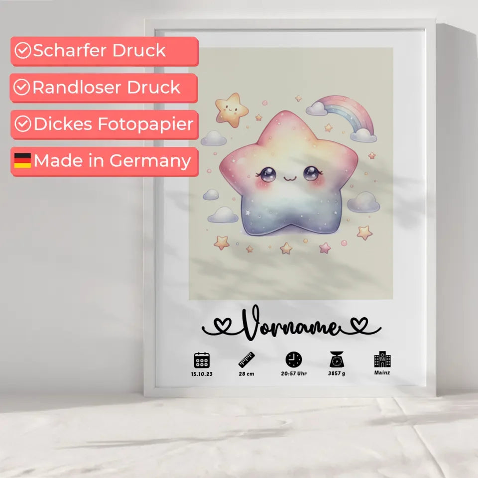 Das personalisierte Poster eignet sich hervorragend als Geschenk zum Geburtstag oder als liebevolle Erinnerung an die Geburt. Mit seinem sanften Cremeweiß fügt es sich harmonisch in jede Kinderzimmereinrichtung ein und wird zum Blickfang. Zeige, wie stolz du auf das neue Leben bist und zaubere deinem Kind ein Lächeln ins Gesicht mit diesem einzigartigen Andenken. Lass deiner Kreativität freien Lauf und gestalte das Poster, das ganz zu deinem kleinen Stern passt! Bestelle jetzt dein personalisiertes Poster Geburt Stern Sweet für das Kinderzimmer und schenke ein Stück Liebe, das ein Leben lang hält.