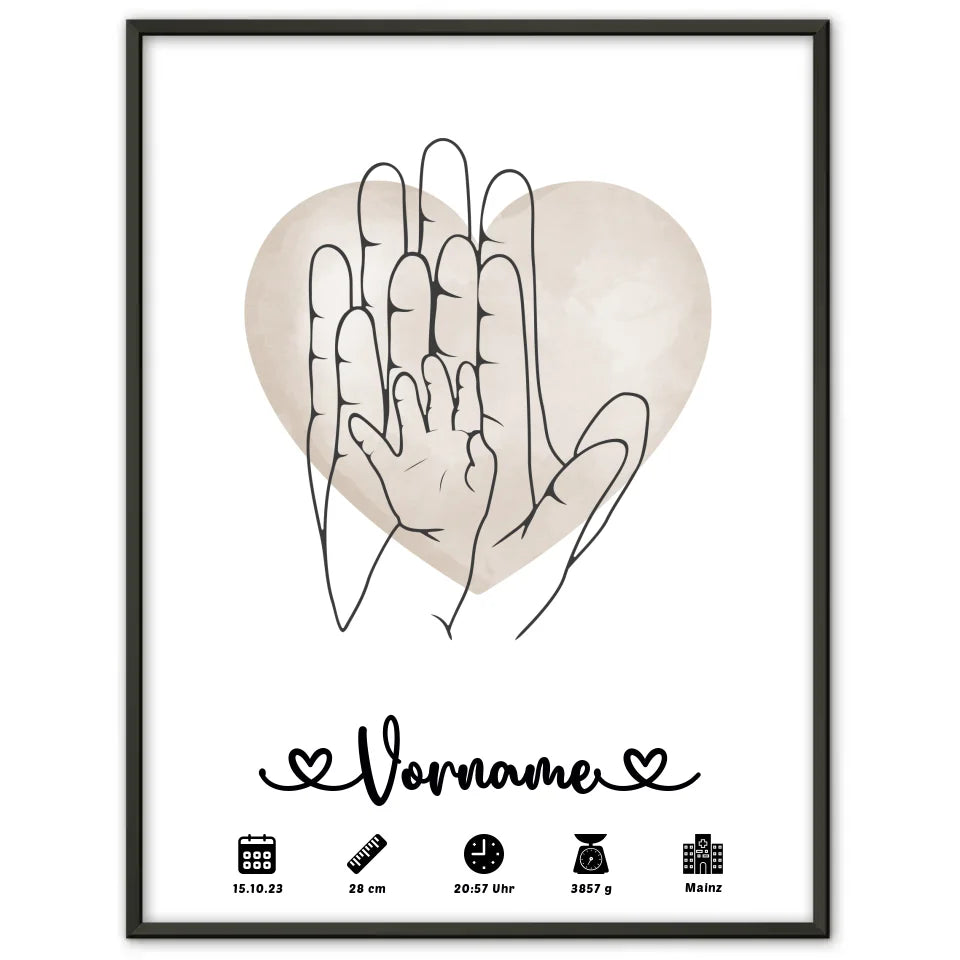 Personalisierte Poster Geburt Wasserfarben Herz Hände Lineart für das Kinderzimmer