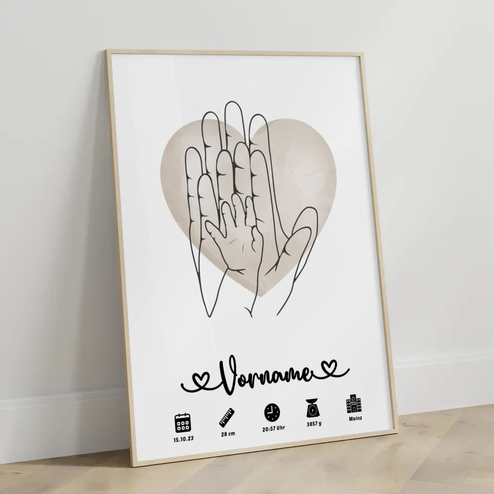 Entdecke unser einzigartiges 'Personalisierte Poster Geburt Wasserfarben Herz Hände Lineart Kinderzimmer', das die perfekte Erinnerung an den schönsten Tag im Leben ist. Dieses personalisierte Poster Geburt wird nicht nur Dein Kinderzimmer verschönern, sondern bring auch die wichtigsten Momente Deines kleinen Wunders auf beeindruckende Weise zur Geltung. Gestalte das Poster ganz nach Deinen Wünschen, indem Du die Geburtsdaten wie Gewicht, Größe, Uhrzeit und Datum sowie den Namen Deines Kindes und ein Hintergrundbild anpasst. Ob zum Geburtstag oder als liebevolle Erinnerung an die Geburt, dieses Kunstwerk ist ein ideales persönliches Geschenk, das Herzen berührt. Mit dem zauberhaften Wasserfarben Herz und der stilvollen Hände Lineart wird das Poster zu einem echten Blickfang in jedem Kinderzimmer. Mach Dein Geschenk unvergesslich mit einem personalisierten Poster, das die Individualität und die liebevollen Momente Deines Kindes einfängt. Setze auf personalisierte Kunstwerke, die Emotionen wecken – für eine bleibende Erinnerung!
