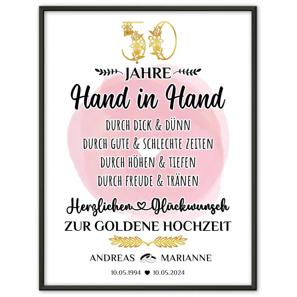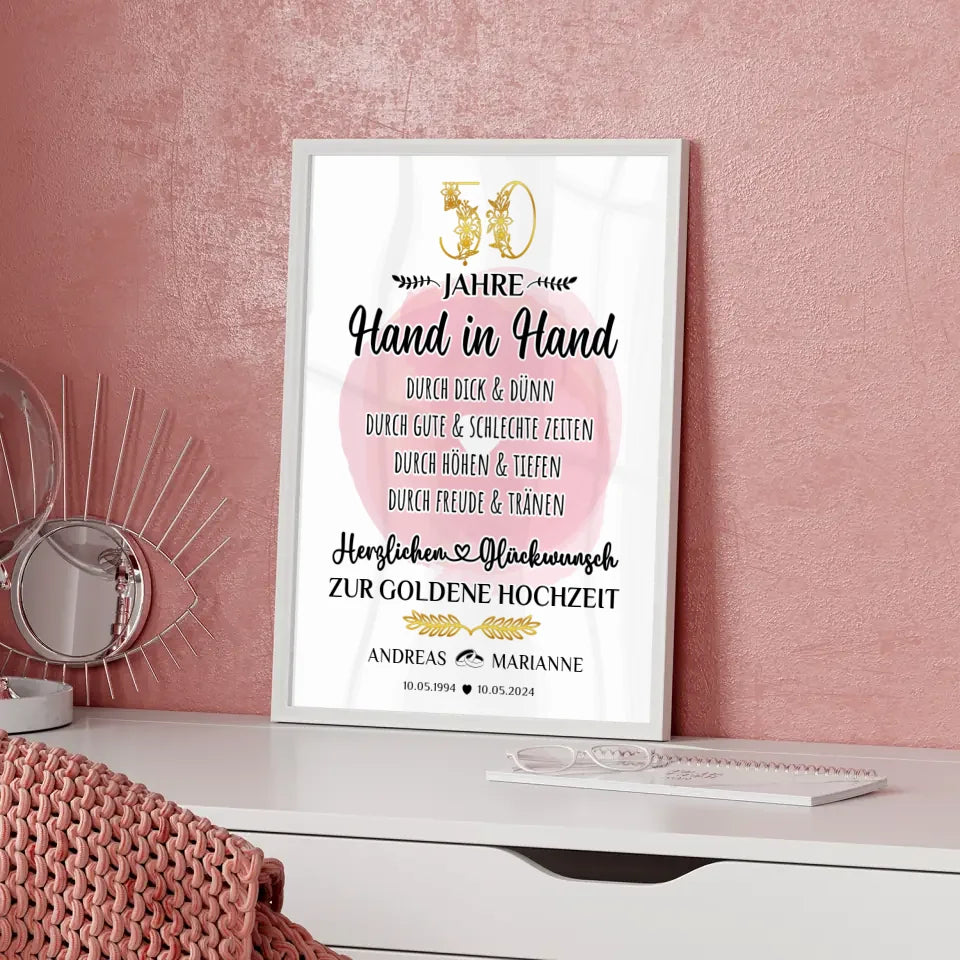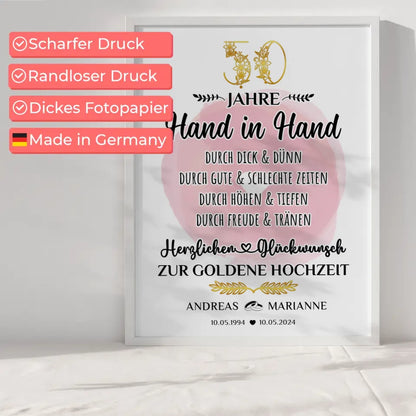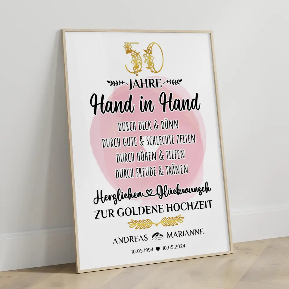 Dieses hochwertige Poster ist nicht nur ein toller Blickfang für jedes Zuhause, sondern auch eine liebevolle Erinnerung an die gemeinsame Zeit „Hand in Hand“. Ideal als Geschenk zum Hochzeitstag, wird es sicherlich Herzen berühren und viele Emotionen wecken.