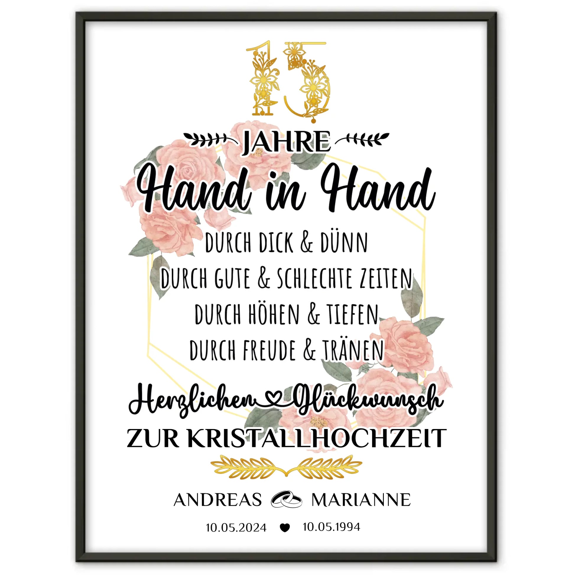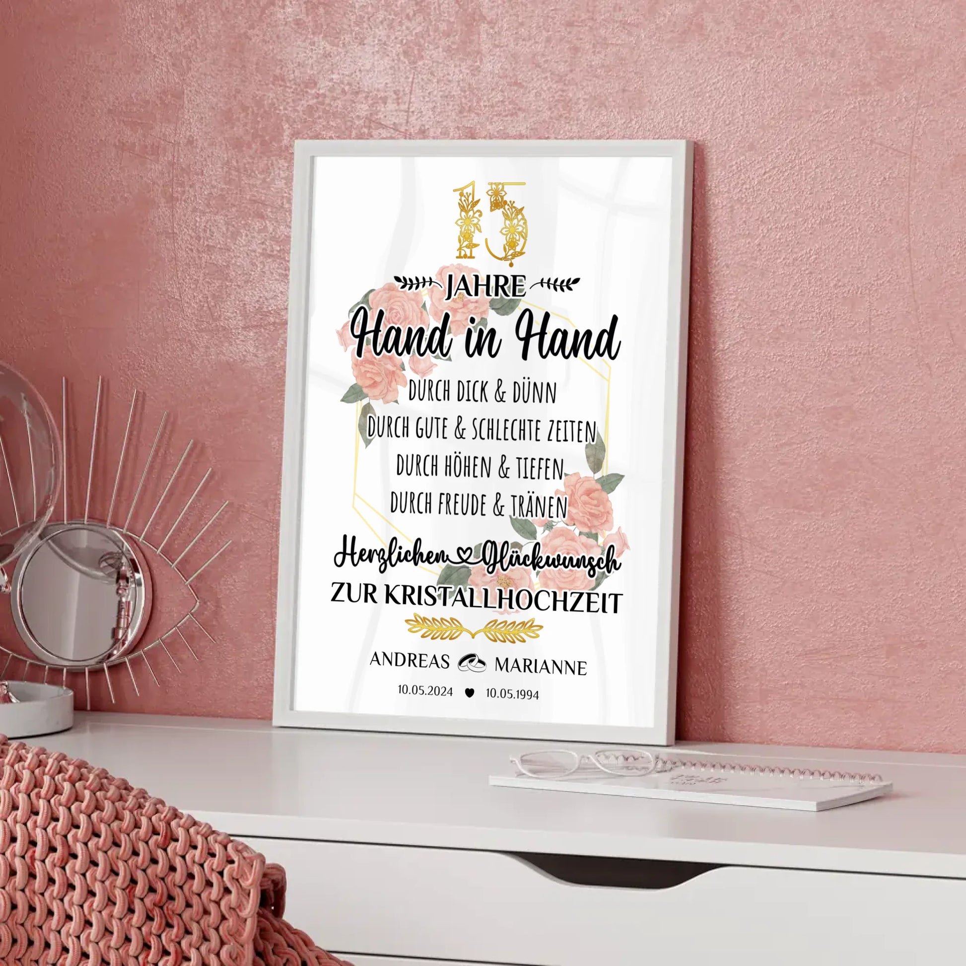 Feiere deinen 15 Hochzeitstag mit einem einzigartigen und personalisierten Poster Geschenk zur Kristallhochzeit! Dieses stilvolle Poster wird individuell für dich gestaltet und enthält die Namen, das Datum und das Hochzeitsjahr – perfekt, um eure Liebe in den nächsten Jahren zu ehren. Das Design „Hand in Hand“ symbolisiert eure untrennbare Verbindung und macht dieses Kunstwerk zu einem besonderen Highlight in eurem Zuhause. Zeige deinem Partner, wie wichtig dieser Tag für euch ist und verschenke ein Poster, das nicht nur dekorativ ist, sondern auch mit emotionaler Bedeutung aufgeladen ist. Für alle, die den 15 Hochzeitstag ein wenig gewohnheitsmäßig leben, ist dieses personalisierte Geschenk eine wunderbare Möglichkeit, eure Zuneigung und Wertschätzung auszudrücken. Sichere dir jetzt dein individuelles Poster Geschenk zum 15 Hochzeitstag zur Kristallhochzeit und lasse eure Erinnerungen lebendig werden!