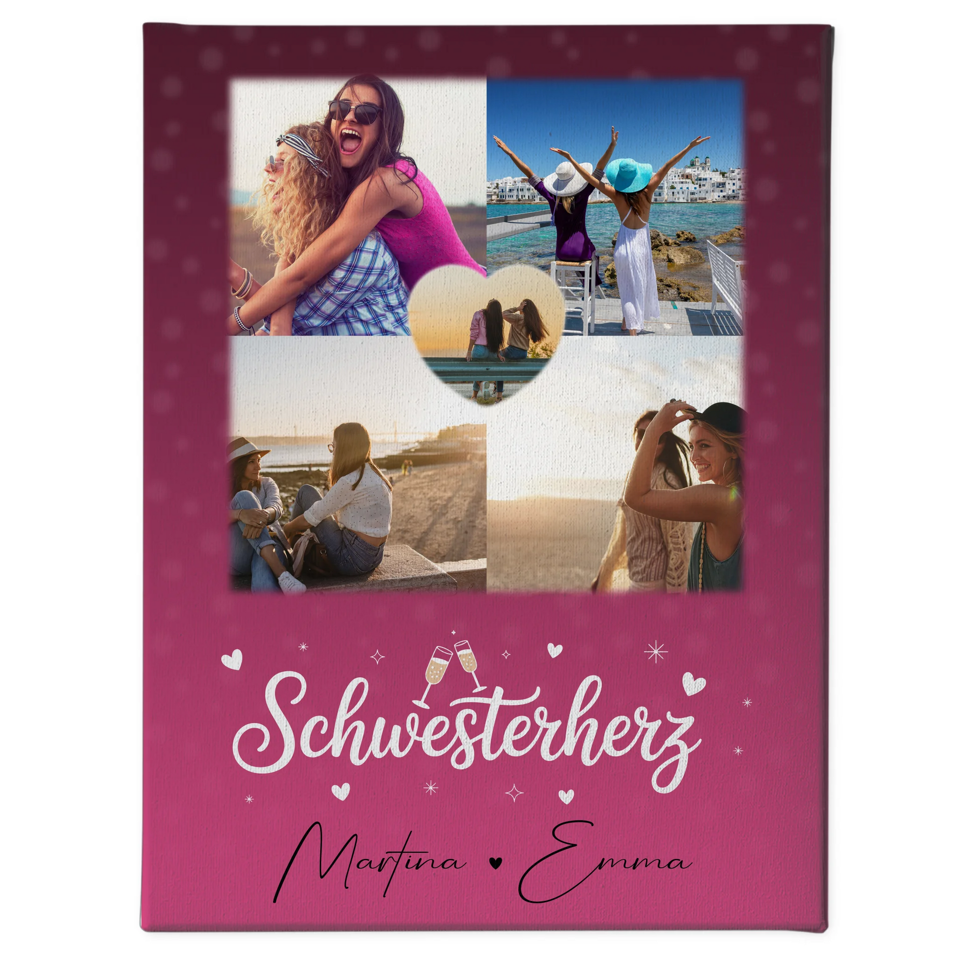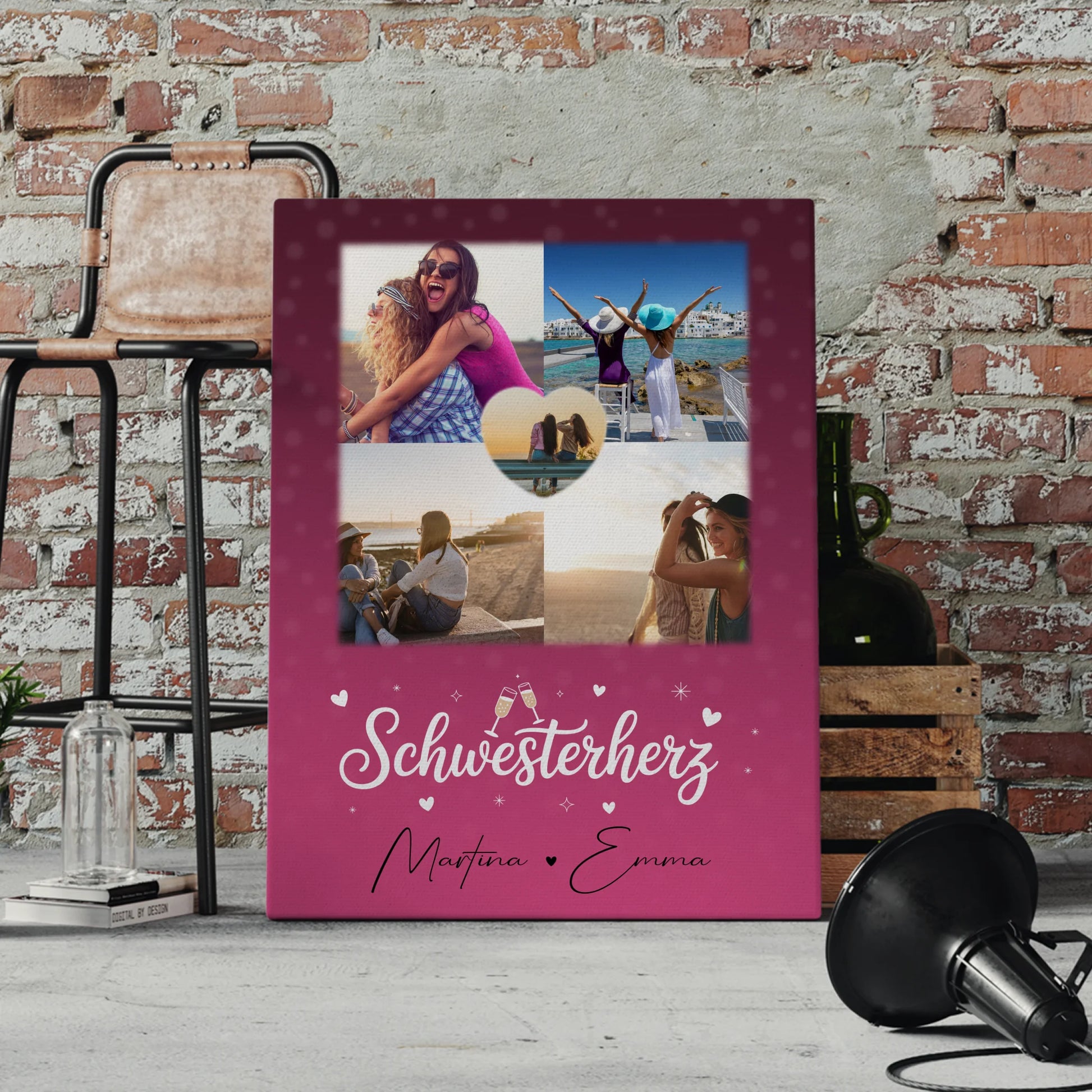 Personalisierte Schwester Leinwand mit 4 Fotos und 1 Herz Foto Geschenk für Geschwister