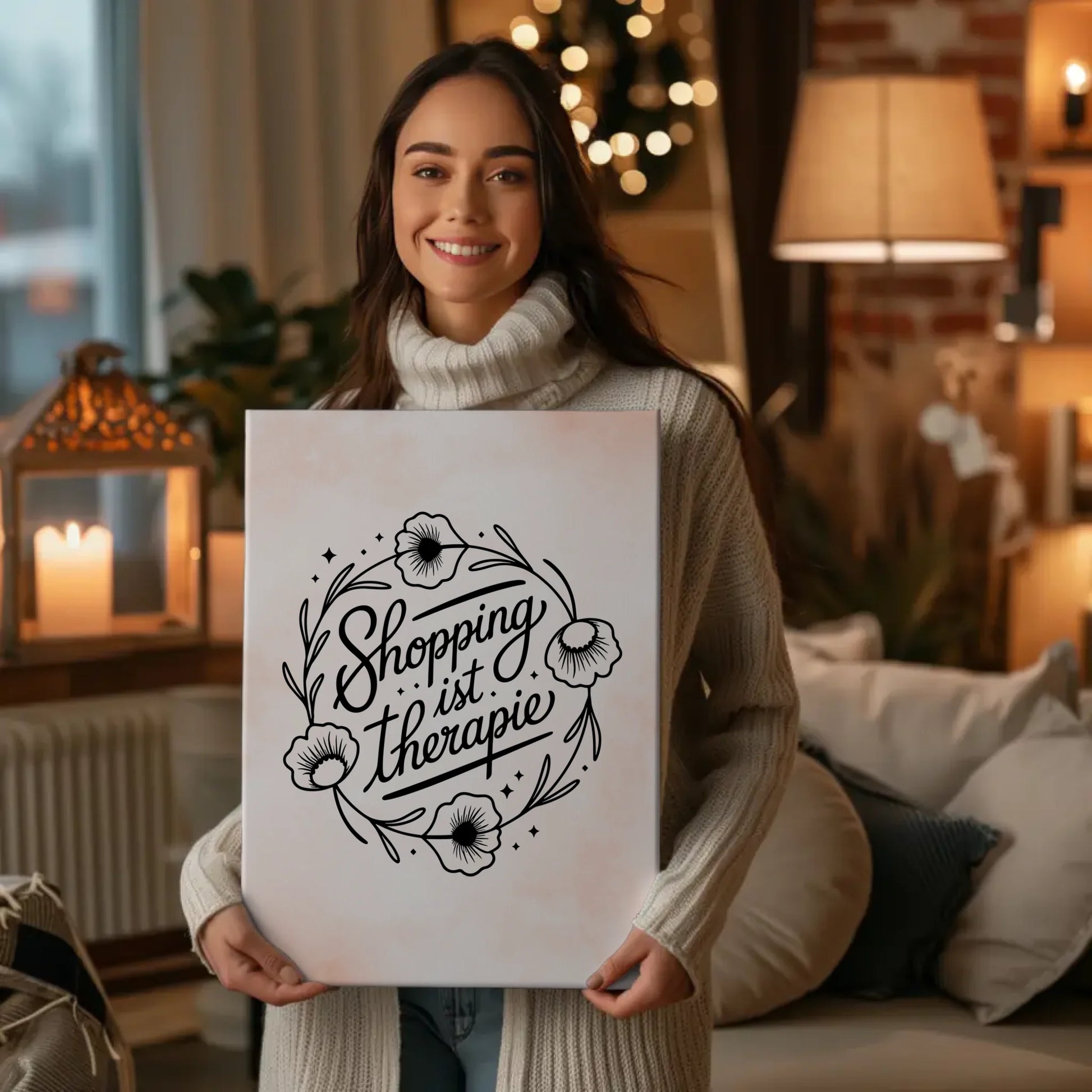 Entdecke die perfekte Möglichkeit, deinen liebsten Menschen eine Freude zu machen mit unserer personalisierten Sprüche Leinwand 'Shopping ist Therapie Geschenk“. Diese einzigartige Leinwand vereint originelle Designs mit der Möglichkeit zur individuellen Gestaltung. Du kannst das Hintergrundbild ganz nach deinen Wünschen auswählen und so ein ganz persönliches Kunstwerk schaffen.
