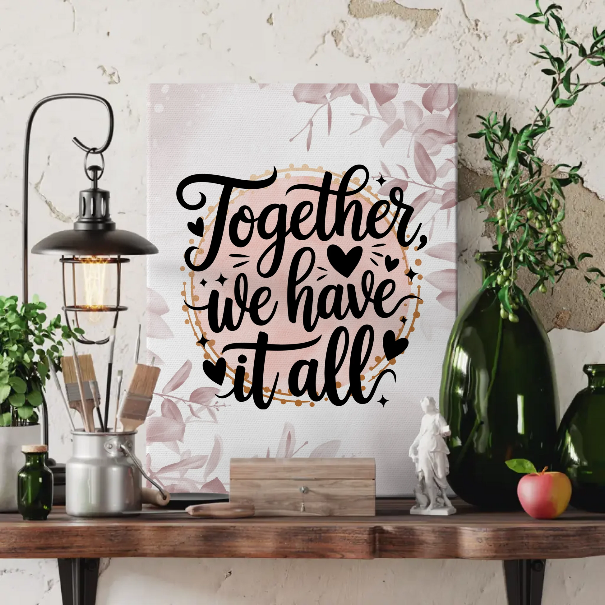 Bestelle jetzt deine personalisierte Leinwand und mache das Leben deiner Liebsten ein Stückchen schöner. Überrasche sie mit einer individuellen Botschaft. Mit der Spruchleinwand 'Together we have it all' drückst du aus, dass ihr gemeinsam alles erreichen könnt!