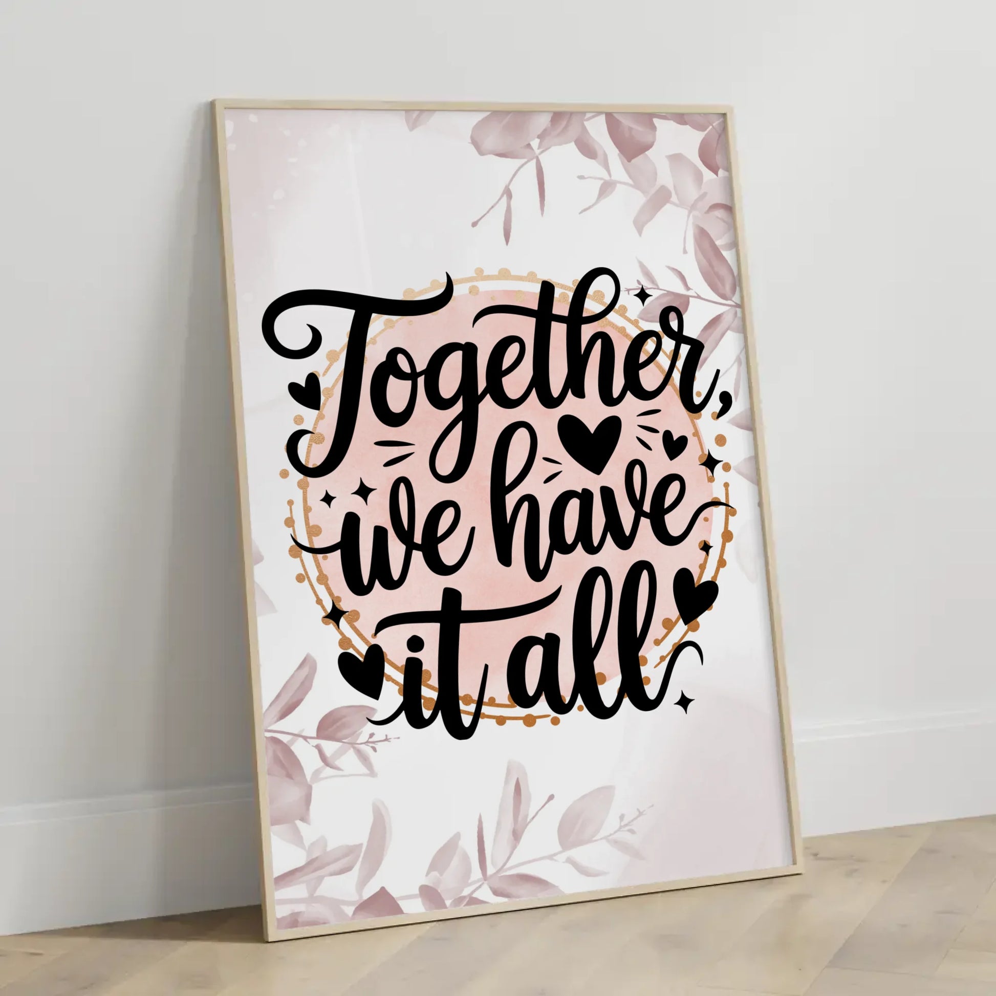 Mach dein Zuhause noch gemütlicher mit unserem einzigartigen personalisierten Sprüche Poster 'Together we have it all'. Dieses besondere Poster mit Spruch lässt sich ganz nach deinen Wünschen gestalten und ist das perfekte Geschenk für jeden Anlass. Ob Geburtstag, Hochzeit oder einfach als liebevolle Geste – dieses Poster wird garantiert Freude bereiten.