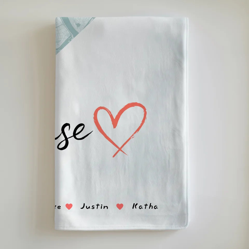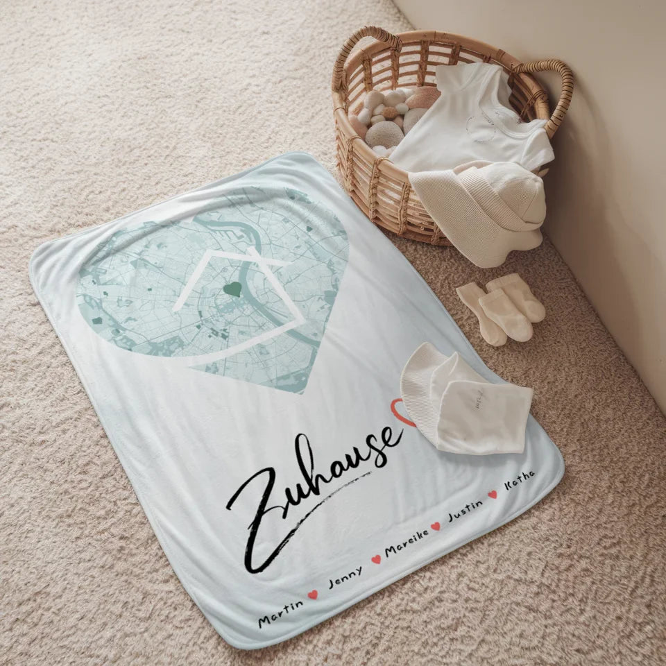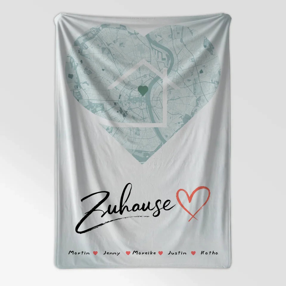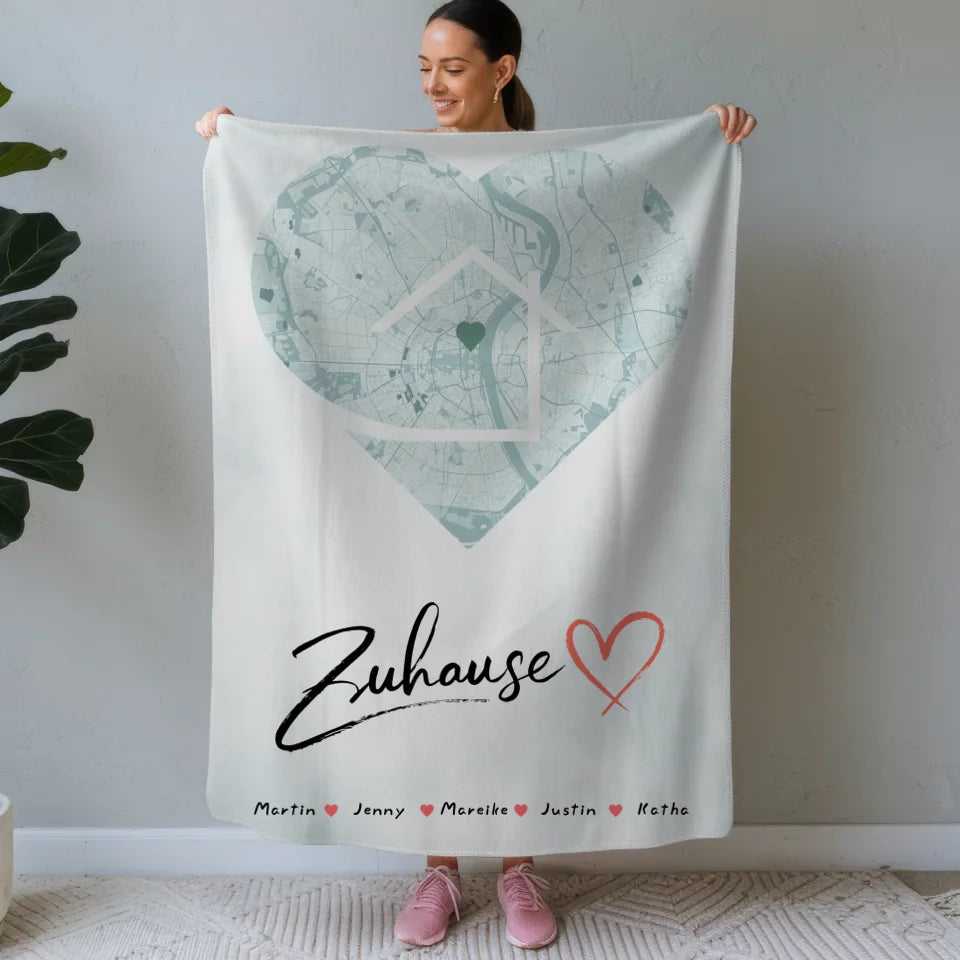 Verleih deinem Zuhause mit der personalisierten Stadtkarte Familien Decke in Herz Form ein besonderes Flair