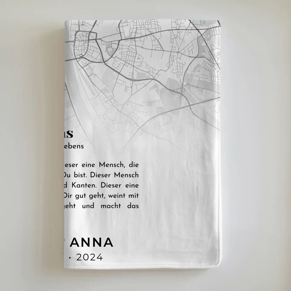 Entdecke die perfekte Kombination aus Stil und Romantik mit unserer personalisierten Stadtkarten Decke für Paare. Diese einzigartige Decke ist nicht nur ein wunderbares Wohnaccessoire, sondern auch ein bedeutungsvolles Geschenk für eure besonderen Momente. Mit dem liebevollen Spruch 'Mit dir wird jeder Moment zu etwas besonderem' wird jedes Kuscheln auf dieser Decke zu einem unvergesslichen Erlebnis. Du kannst die Karte mit einem besonderen Ort, den Namen eurer Wahl und einem persönlichen Spruch oder Wunschtext gestalten. Diese personalisierte Decke eignet sich ideal als Geschenk zum Valentinstag, zum Geburtstag oder auch zu Weihnachten. Zeige deinem Partner, wo alles begann und festige eure gemeinsame Geschichte mit dieser stilvollen Stadtkarten Decke. Lass dein Zuhause noch behaglicher werden und verschenke eine liebevolle Erinnerung, die garantiert ein Lächeln auf die Lippen zaubert. Wähle jetzt deine Variante und mache die Definition Liebe Des Lebens zu einem greifbaren Erlebnis!