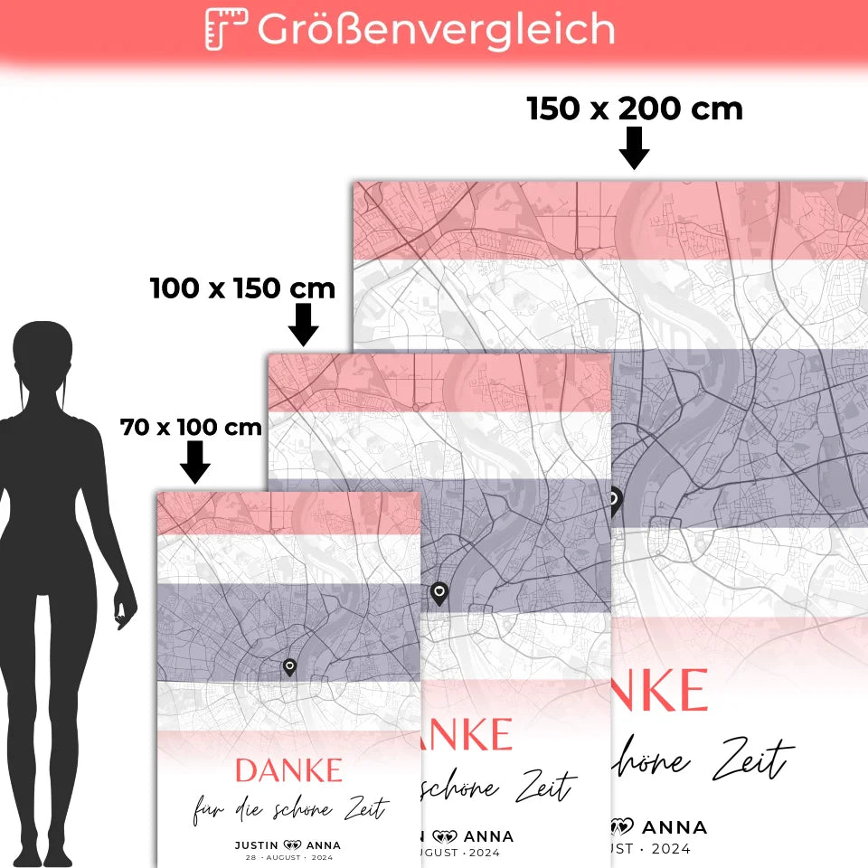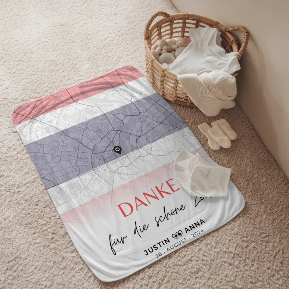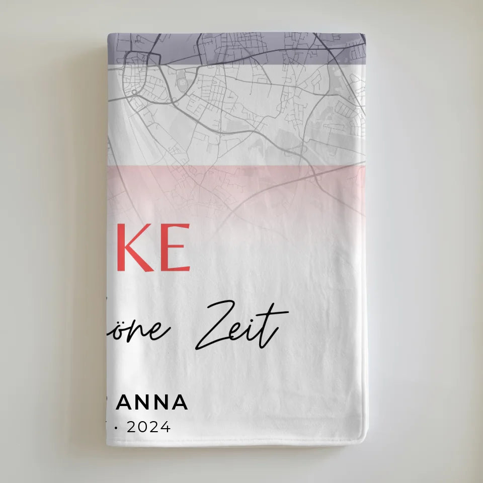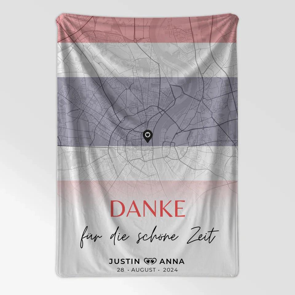 Bei der personalisierten Stadtkarten Decke kannst du ein Foto, eine Karte von einem besonderen Ort, eure Namen sowie einen eigenen Spruch oder Wunschtext hinzufügen. Feiere besondere Anlässe wie den Valentinstag, Geburtstage oder Weihnachten mit diesem besonderen Geschenk. Der schöne Spruch 'Danke Für Die Schöne Zeit' ziert das Design der Decke und verleiht ihm eine romantische Note.