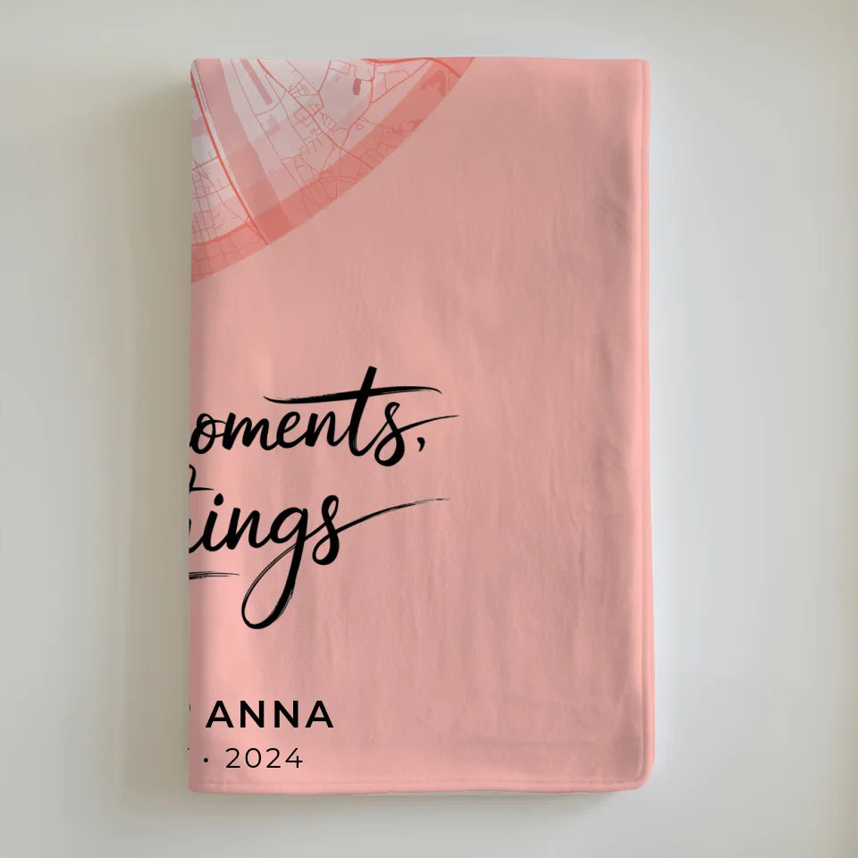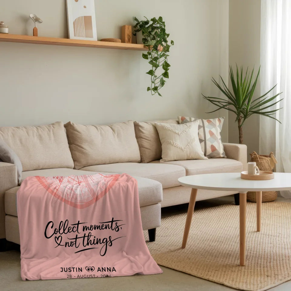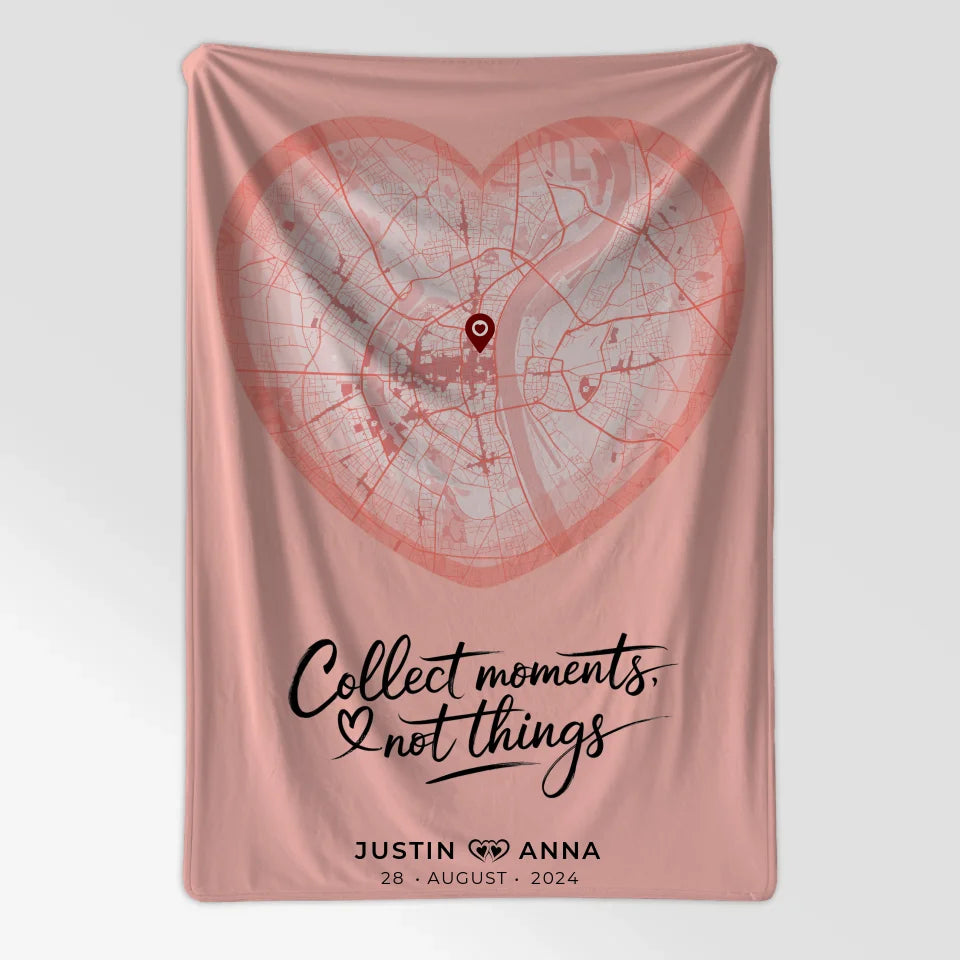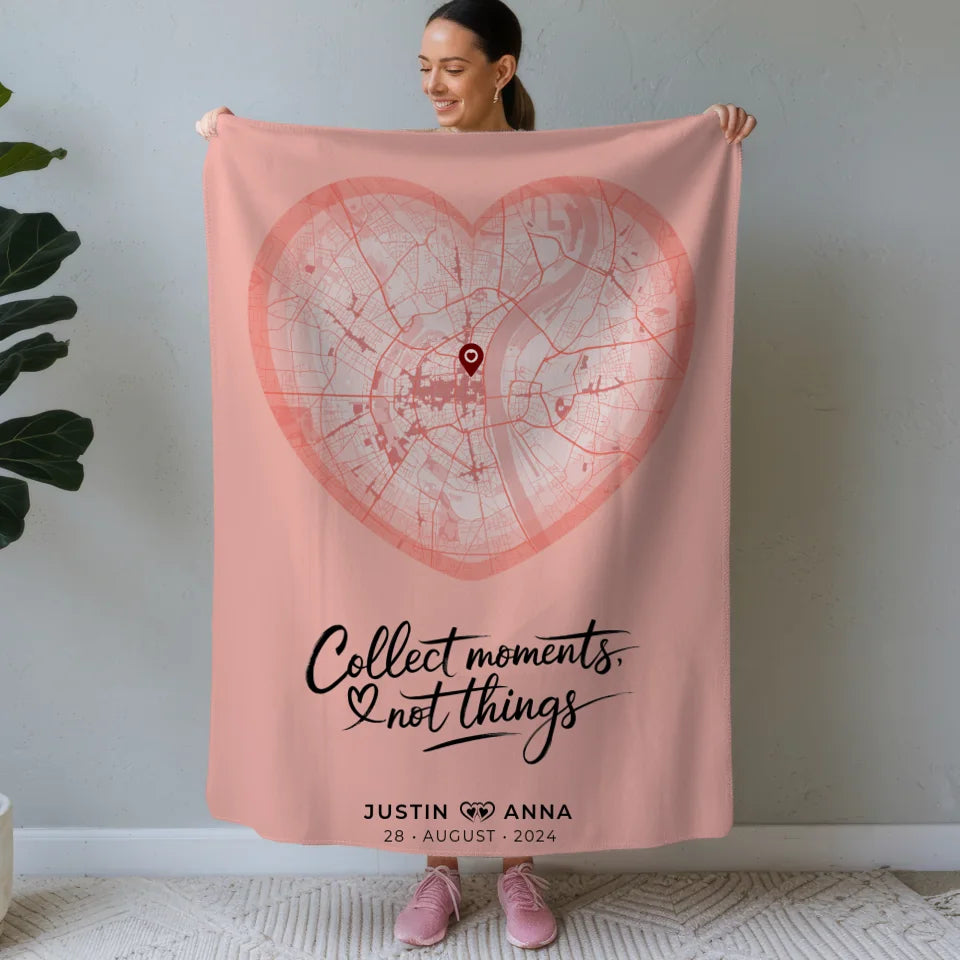 Diese Decke ist nicht nur praktisch, sondern auch ein echtes Unikat! Sie zeigt, wo alles begann und vereint Eure schönsten Erinnerungen auf stilvolle Weise. Das zarte Altrosa und das schöne Herz-Design machen die Decke zu einem romantischen Blickfang und passen perfekt in jedes Zuhause. Die Botschaft 'Collect Moments Not Things' wird Euch daran erinnern, die besonderen Augenblicke miteinander zu teilen und zu würdigen.