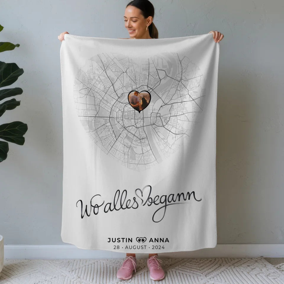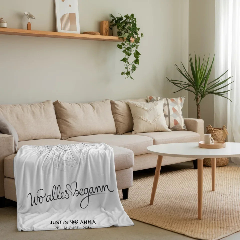 Suchst du nach einem einzigartigen Geschenk für dein Lieblingspaar? Die personalisierte Stadtkarten Decke "Paare Herz Wo Alles Begann" ist die perfekte Wahl! Diese flauschige Decke zeigt nicht nur den zauberhaften Spruch "You & Me", sondern kann auch ganz nach euren Vorstellungen gestaltet werden. Wähle einen ganz besonderen Ort, der für euch beide eine bedeutende Rolle spielt, füge eure Namen hinzu und bringe einen eigenen Spruch oder Wunschtext an. So wird jede Decke zu einem individuellen Unikat.