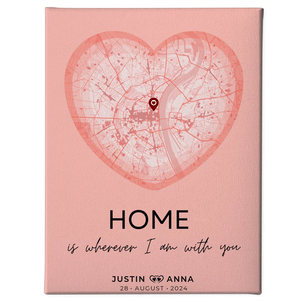 Personalisierte Stadtkarten Leinwand Herz Altrosa Paare Home Is Wherever I Am With You