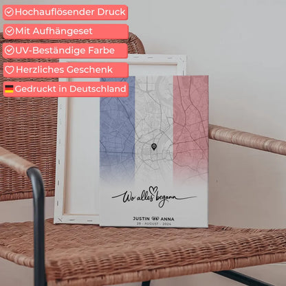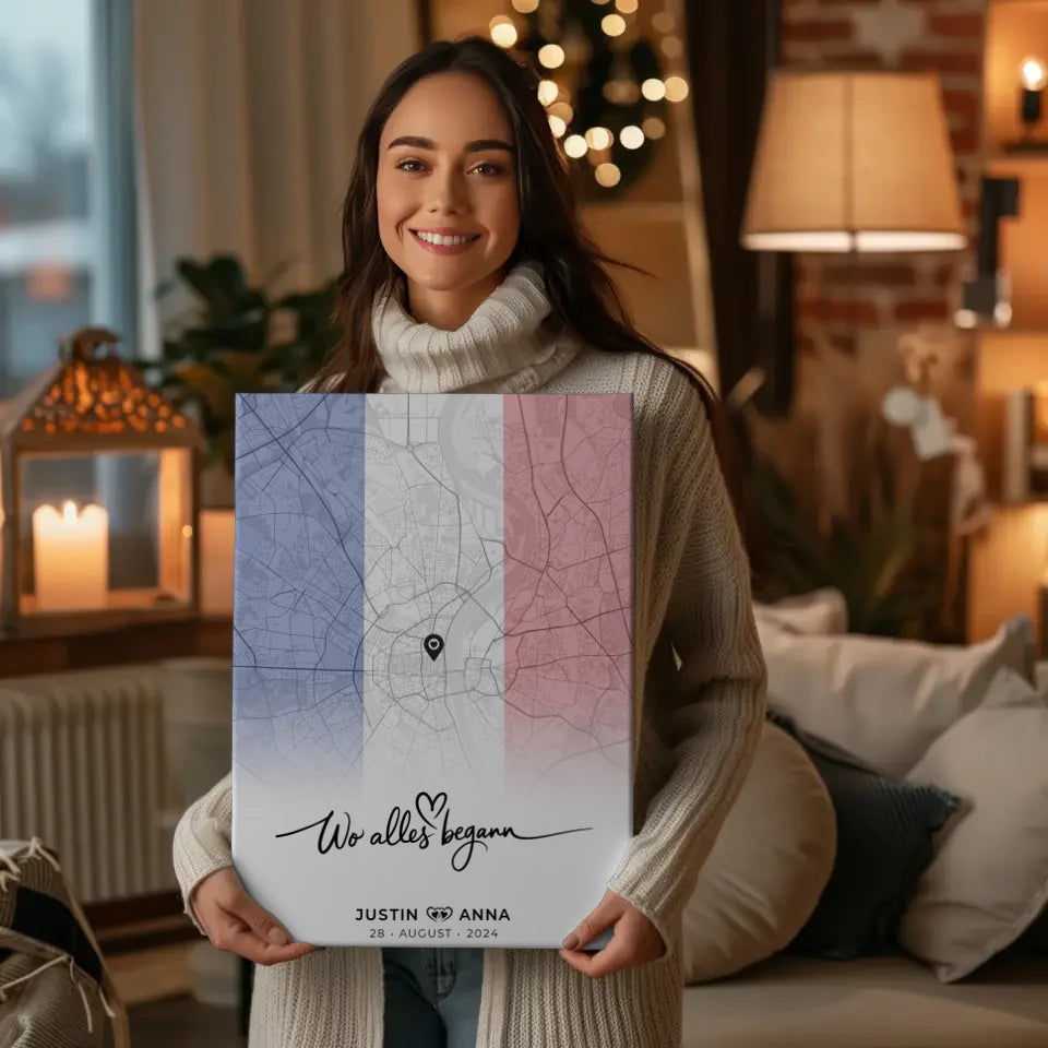 Unser Design beinhaltet den inspirierenden Spruch 'Wo Alles Begann', der die Bedeutung eurer gemeinsamen Reise unterstreicht. Gemeinsam die schönsten Erinnerungen festhalten – das ist es, was unsere personalisierte Stadtkartenleinwand auszeichnet. Zögere nicht und mache dieses einzigartige Kunstwerk zu einem Teil deiner Einrichtung! Die Leinwand ist in verschiedenen Größen erhältlich und passt perfekt in jeden Raum, ob Schlafzimmer, Wohnzimmer oder Flur. Schaffe dir oder deinem Partner einen Erinnerungsort aus dem Urlaub in Frankreich, an dem all eure schönen Momente festgehalten werden.