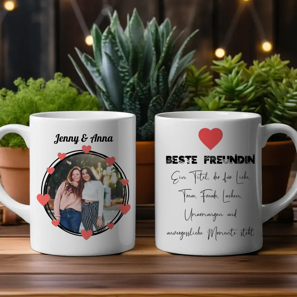 Du würdest gerne etwas einzigartiges schenken? Dann ist unsere Personalisierte Tasse Freundinnen Beste Freundin Ein Titel für Liebe Freude Lachen Fototasse das perfekte personalisierbare Geschenk.