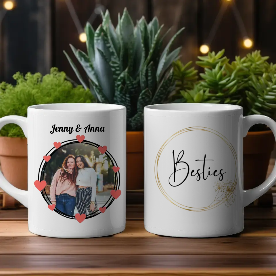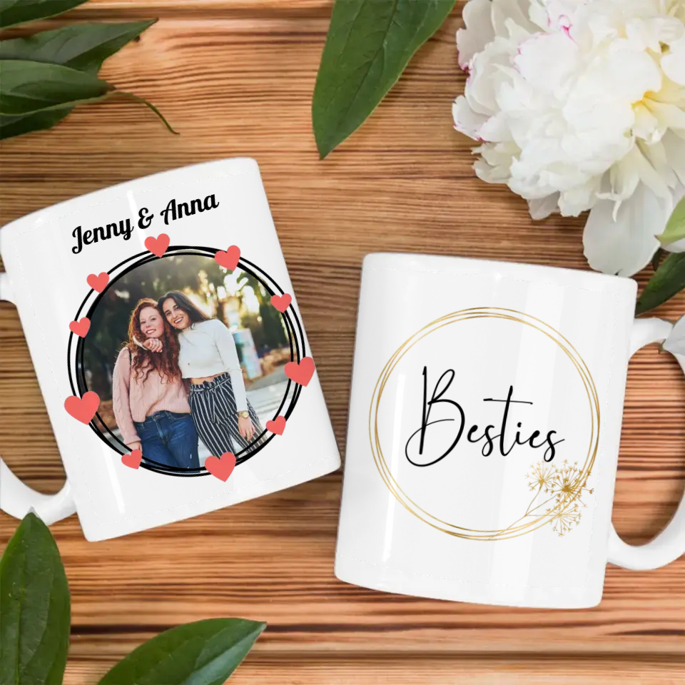 Du suchst ein tolles Geschenk? Dann ist unsere Personalisierte Tasse Freundinnen Besties Gold Rahmen Pusteblume Fototasse das perfekte personalisierbare Geschenk.