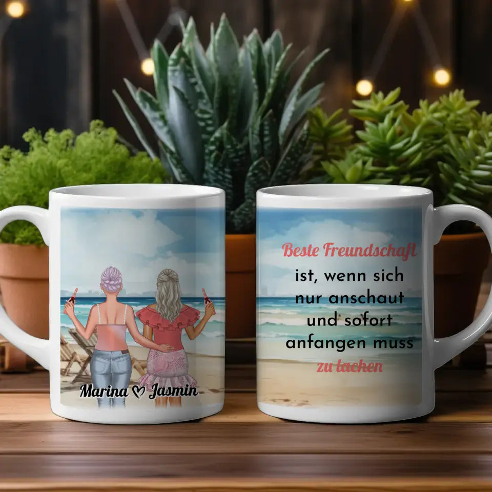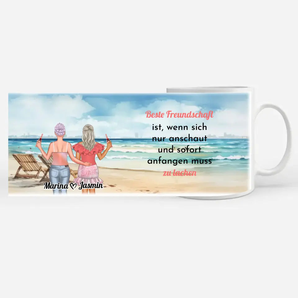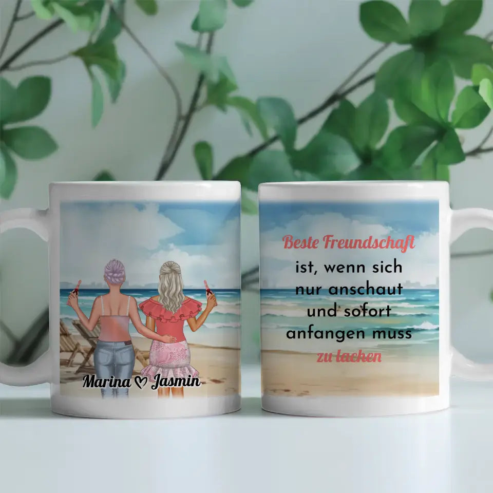 Personalisierte Tasse für 2 Freundinnen Meer mit Liegestühlen