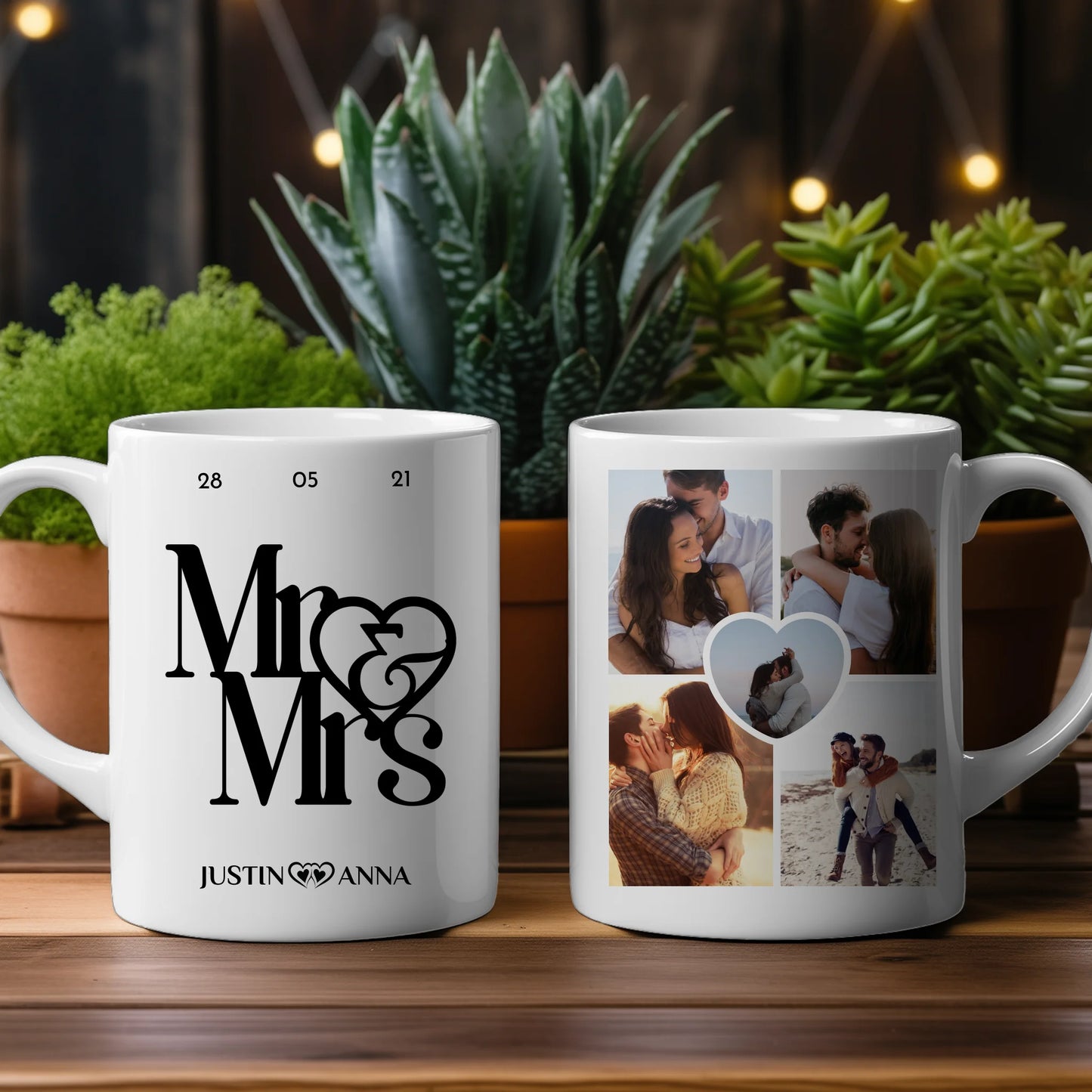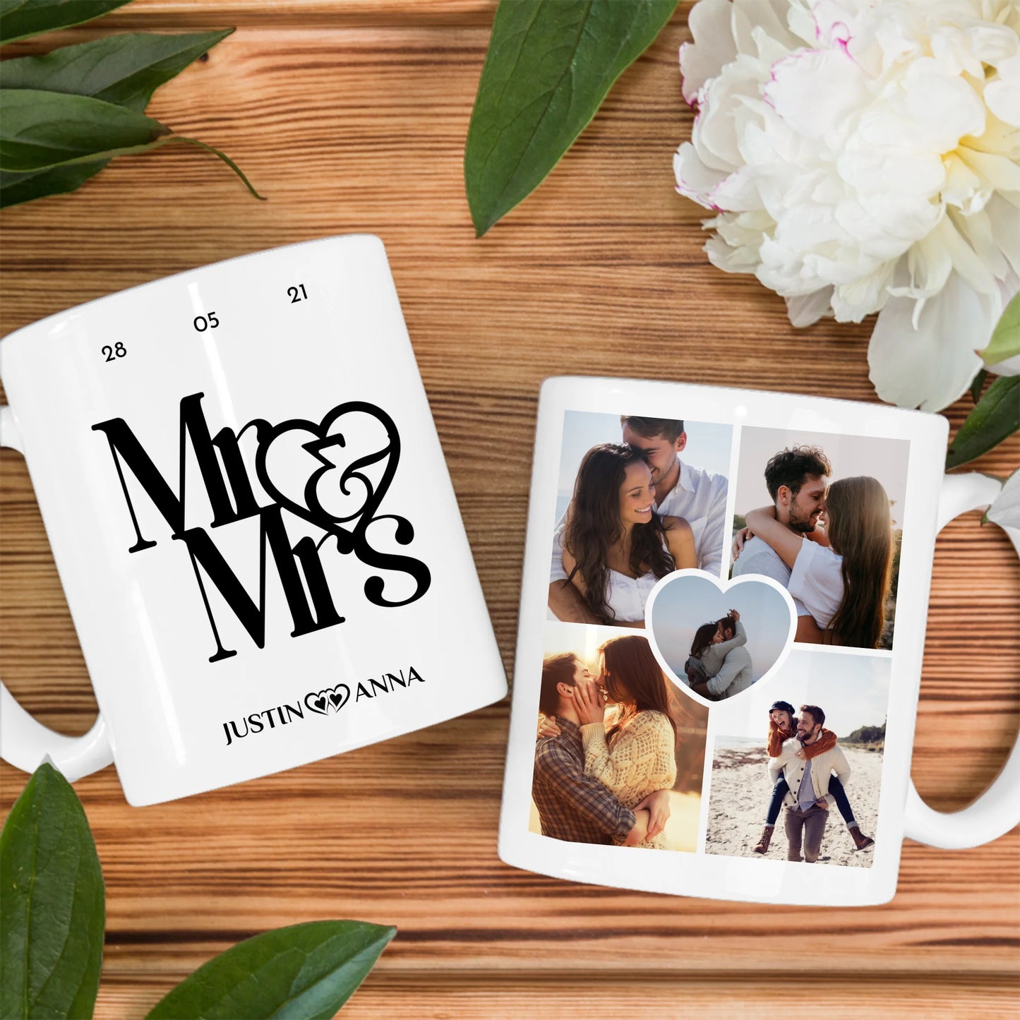 Unsere Personalisierte Tasse mit 5 Fotos Mr & Mrs mit Ringen