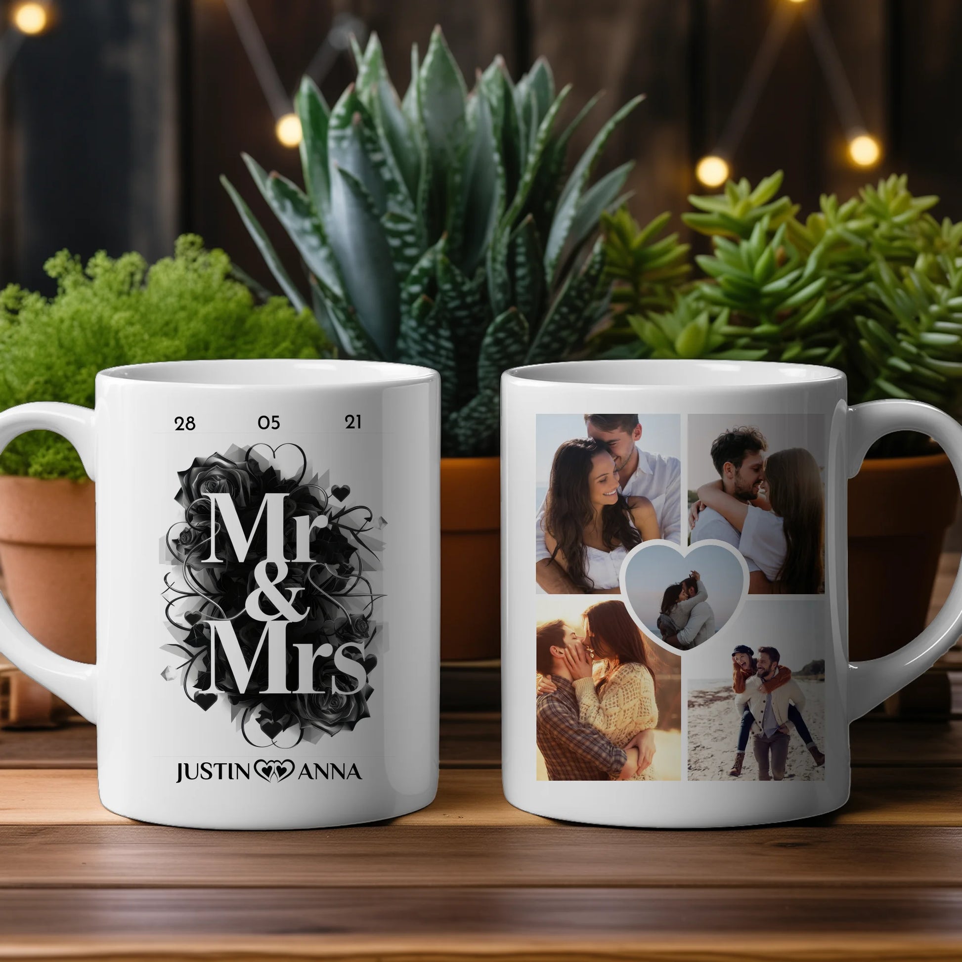 Du suchst ein schönes und individuelles Geschenk? Dann ist Unsere Personalisierte Tasse Mr and Mrs mit 5 Fotos ein wirklich einzigartiges personalisiertes Geschenk.