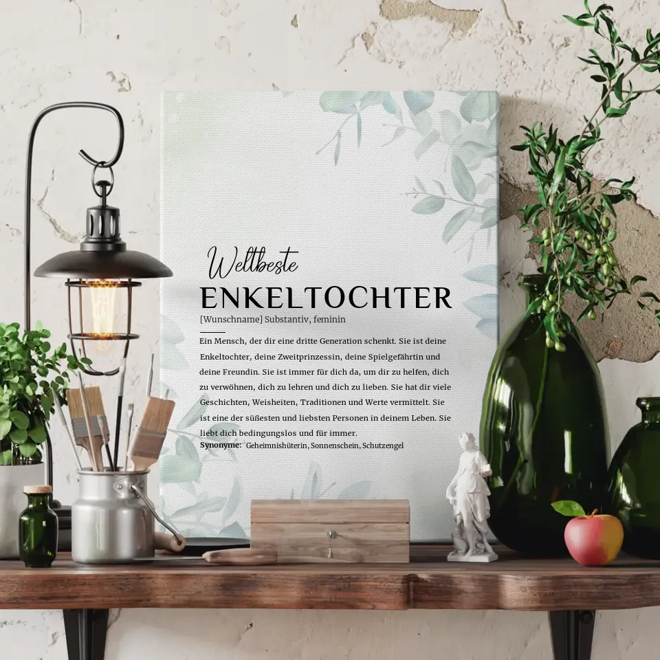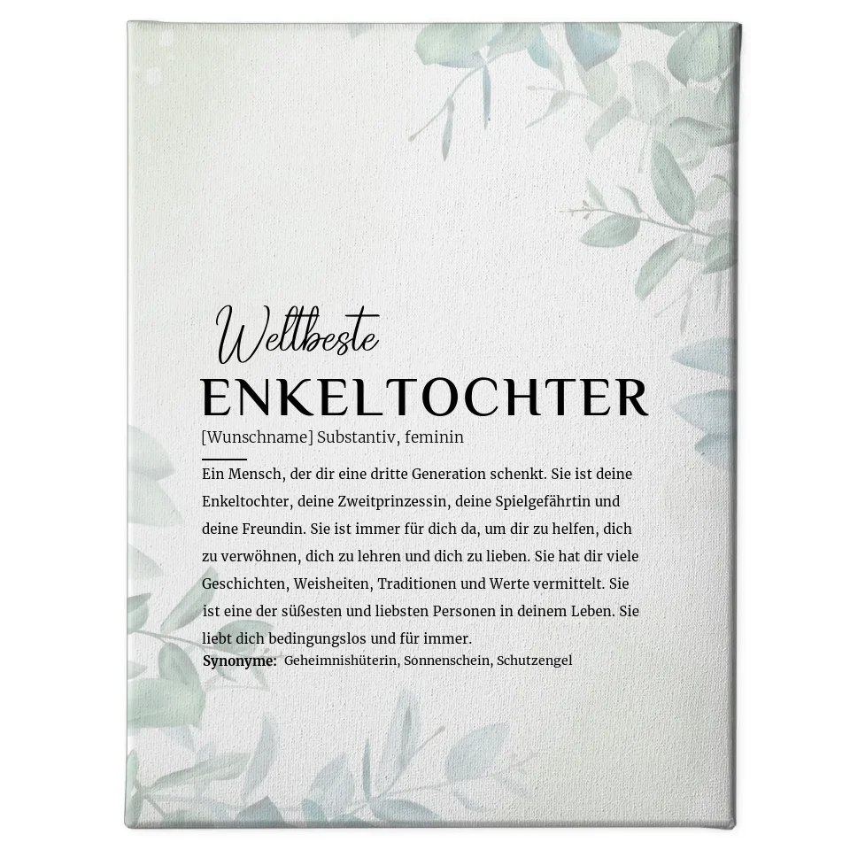 Der sanfte Eukalyptus Stil verleiht der Leinwand nicht nur einen modernen Look, sondern harmoniert auch mit verschiedenen Einrichtungsstilen. Diese Leinwand ist nicht nur ein dekoratives Element, sondern auch ein liebevolles Statement, das die Bedeutung deiner Enkeltochter in deinem Leben hervorhebt. Lass deiner Kreativität freien Lauf und gestalte eine Leinwand, die für immer in Erinnerung bleibt.